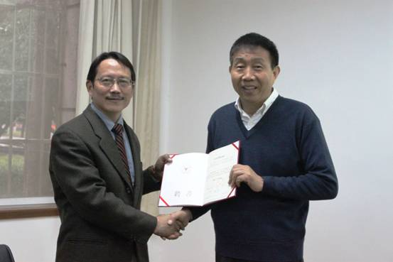 浙江大学包玉刚讲座教授张统一老师的受聘仪式暨学术报告会于12月24上午在玉泉校区教12-118室举行。浙江大学邹鸿生教授为张统一教授颁发了浙江大学包玉刚讲座教授聘书并佩戴了浙江大学校徽。包玉刚校内合作教授陈伟球老师主持了此次报告会,他对张统一教授的来访并成为浙大的一员表示热烈的欢迎,希望他的定期来访和交流能够进一步加强香港科技大学机械系和浙江大学航空航天学院在人才培养和科学研究等方面的联系与合作。张统一教授作了题为“Strained ferroelectric thin films” 的学术报告,主要介绍了如何利用错配应变来调控铁电薄膜的各种材料性能。浙江大学应用力学研究所和土木系的部分教师及研究生参加了此次报告会。
