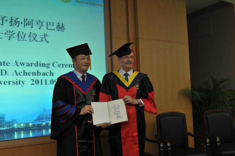 2011年9月6日至9日,美国西北大学Walter P. Murphy和McCormick杰出学院教授Jan D. Achenbach成功访问了浙江大学。Achenbach教授此行来访是受浙江大学邀请来杭获授名誉博士学位。根据《中华人民共和国学位条例》规定,浙江大学学位委员会全体委员表决通过,并报国务院学位委员会同意,浙江大学决定授予美国西北大学教授Jan D. Achenbach名誉博士学位。