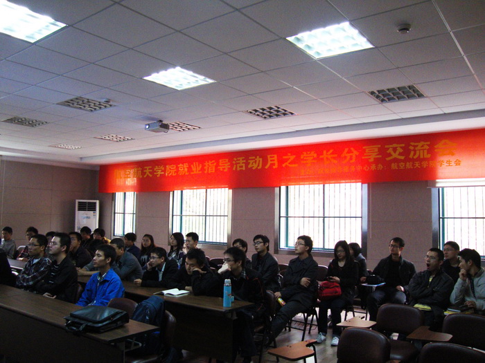 为帮助刚确认到航院的2010级本科生加深对专业的认识和对未来职业方向的了解,正确地规划大学生活,同时也为了增进学院学生之间的相互交流,11月20日下午14点30分,学院在教五333会议室举办了航院就业指导活动月系列之学长交流会。院团委书记戴志潜老师、5位毕业生优秀学长、08级部分学长、09级部分学长以及10级部分已确认到航空航天学院的本科生参加了交流会。