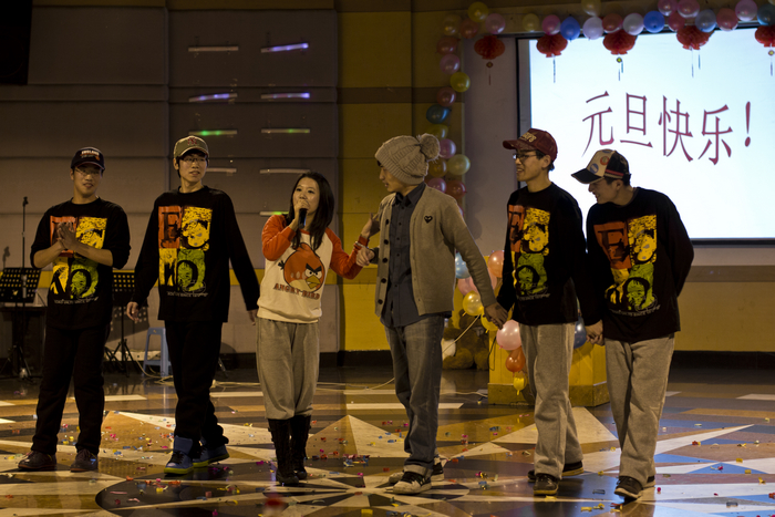 Codemonkey乐队敲响了晚会的第一个音符。主唱快节奏的歌声和着强劲有力的鼓点加之清脆高昂的电吉他声,如同冬日里一个熊熊燃烧的火把,瞬间将大家的激情点燃,整个会场气氛迅速升温,这是青春与激情的碰撞。接下来,衣着光艳的同学们轮番上场,大家各显身手,尽释其才,整场晚会节目精彩纷呈,高潮迭起,现场光芒耀眼,呐喊声叫好声交织在一起,整个会场被欢声笑语笼罩着。有人说今年是个穿越年,《我们都是木头人》紧跟时尚潮流,开始上场的还是粉黛蛾眉,温柔可人的古代美娇娘,她的一颦一笑触动了在场的观众神经,大家还沉浸在她柔美的声音中,眨眼间,她一改原貌,带领四个帅男,跳起了动感十足,火辣劲爆的hip-hop,让观众大跌眼镜,不自禁地拍手叫好。《孔雀东南飞》又一次把观众拉回了千年之前,原本凄凉悲怆的爱情故事经我们的演员独具创意的改编之后,变成了笑料不断的情景喜剧,他们幽默诙谐的台词和滑稽夸张的表情,让现场观众捧腹大笑,半饷都直不起腰。