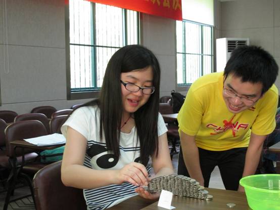 第十四届学生科技文化节之航空航天学院“寻找力学哥”趣味堆硬币比赛于5月5日下午1点在教五-333顺利举行。首先,主持人介绍了比赛规则,并分发给每位参赛选手200枚硬币。比赛分为两个赛时。第一赛时,参赛选手需要利用200枚硬币,将其堆成伸出桌面边缘尽可能多的结构;第二赛时,参赛选手将尝试在一枚硬币上面叠尽可能多的硬币,以形式优美为佳。比赛分为两场进行,每场每个赛时半个小时时间。航空航天学院本科生及外院系同学共16人参加并完成了激烈的角逐,工作人员如实记录了比赛成绩,并对作品进行了拍照。随后,将由嘉宾评选出一、二、三等奖。