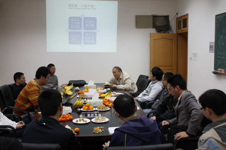 支部书记王鹏博士首先通过近期贵州毕节五名流浪儿的悲剧,配以生动的幻灯片和音乐,提出了农民工子女教育和安全等问题;李铁风老师结合新闻图片谈了湖南老家农村空心化,村容凋敝的问题;李倩倩博士提出了对留守儿童群体的诸方面担心;龚博、冯琼、胡昉、金涛等博士由围绕新闻就计划生育、城乡教育设施和水平差异以及农村教育重男轻女等议题发表了自己的看法;董臣令、张逸尘等博士认为应该加大社会保障特别是底层弱势群体的保障力度;徐明、黄洋博士就民工子女的异地教育和安全管理问题给出了自己的意见;董策舟、单晔杰、刘德重等博士认为加大教育和科研投入十分必要,驳斥了社会上一度盛行的“读书无用论”;王鹏博士补充说教育应该多元化,尤其在欠发达地区,更应该让家庭转变传统观念,加大职业教育的投入。