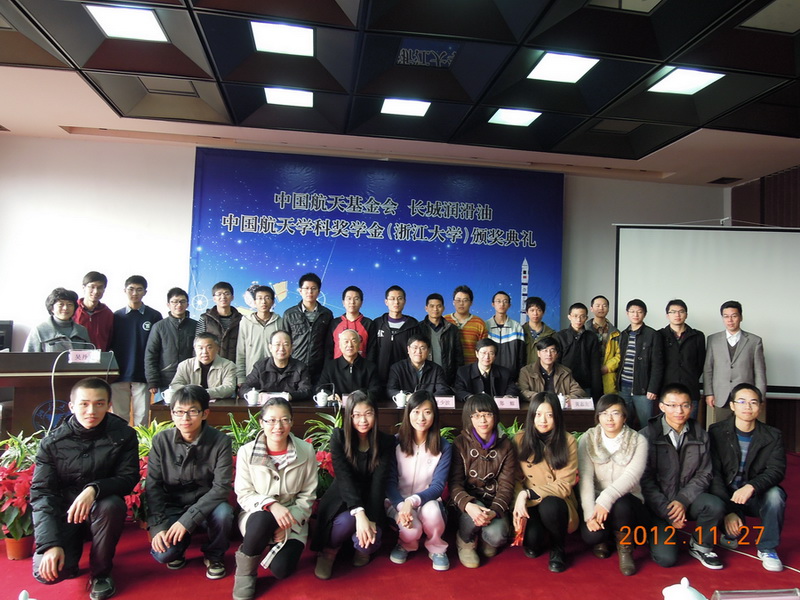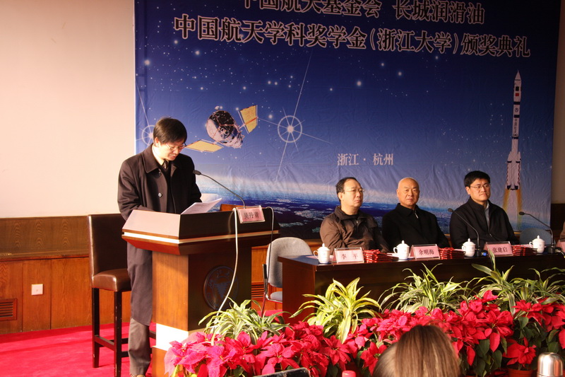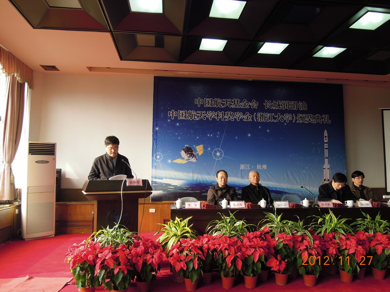 11月27日上午9:30,中国航天基金会·长城润滑油航天学科奖学金第三届颁奖典礼在我校玉泉校区邵科馆212室隆重举行。原中国人民解放军总装备部副部长、现任中国航天基金会理事长张建启中将,原东海舰队副政治委员余明海少将以及我校党委任少波副书记、航空航天学院常务副院长郑耀,副院长李平、黄志龙等出席了颁奖典礼。颁奖典礼由航空航天学院党委书记吴丹青主持。