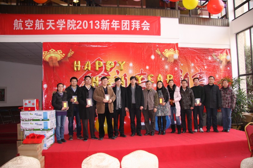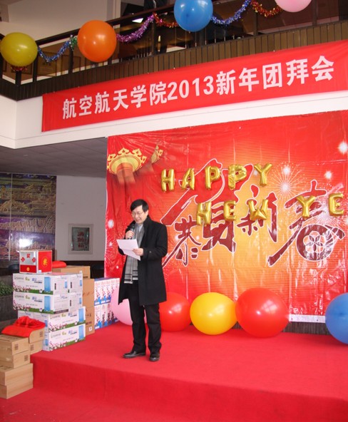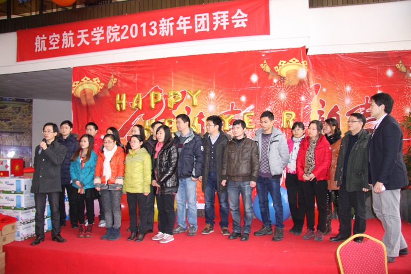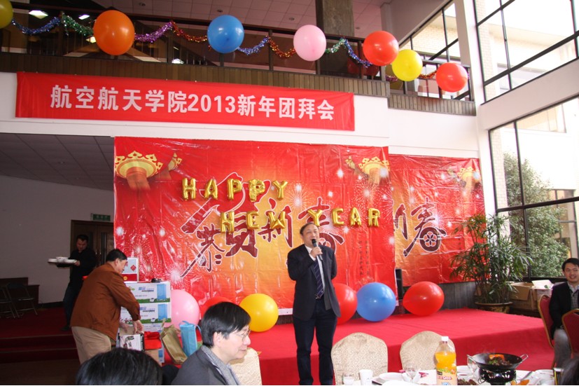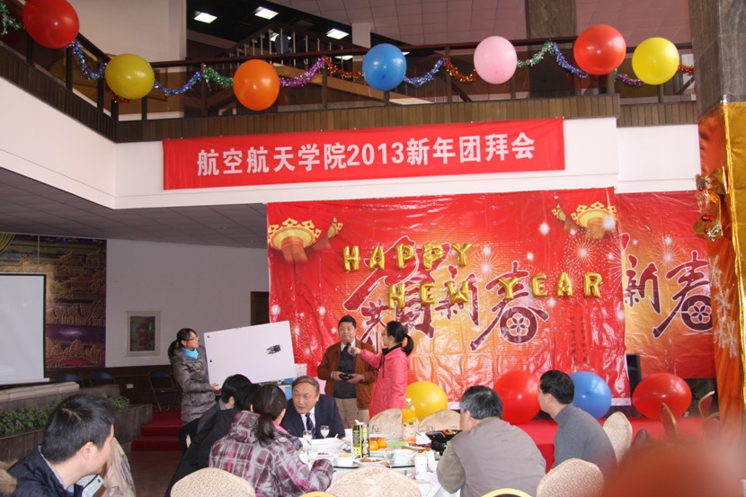 辞旧岁迎新年,同开怀共联欢。2013年1月25日中午,航空航天学院新年团拜会在玉泉校区邵科馆一楼大厅举行。2012年新入职的教师代表应迪清和李铁风共同主持了本次团拜会。全体在职与离退休教职工近200人欢聚一堂,固体力学学术带头人、应用力学研究所杨卫教授到场与学院全体老师共迎新年,共同展望学院未来的发展前景。
