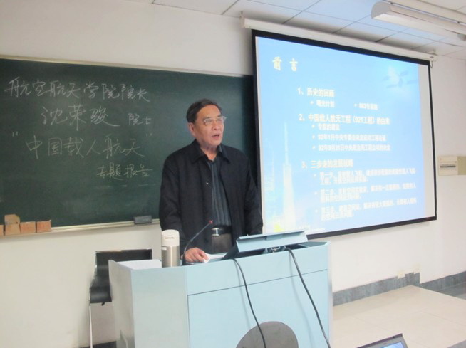 2013年4月17日19:30,浙江大学航空航天学院院长沈荣骏院士关于“中国载人航天”的专题报告在紫金港校区西2-309教室顺利举行。来自航空航天学院、浙江大学微小卫星俱乐部以及《卫星技术》通识课的众多学生慕名而来,现场气氛热烈,报告会取得圆满成功。