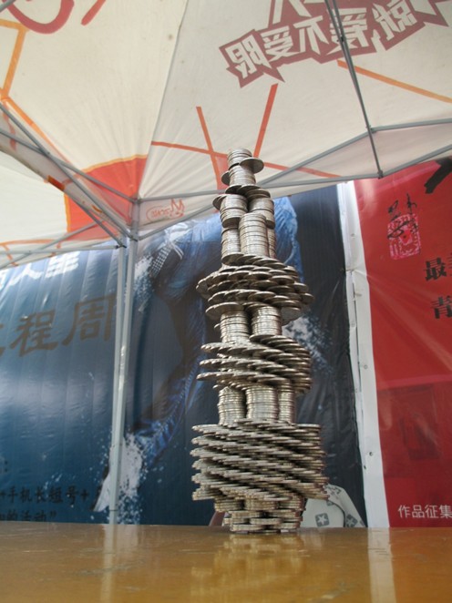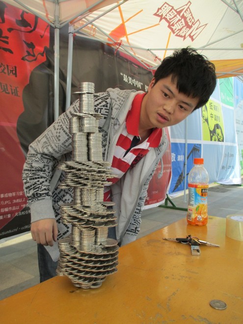 比赛的规则是在一枚硬币上堆砌尽可能多的硬币,其比赛难度和所需力学知识量可想而知,在场比赛的选手在堆硬币的过程中不断思考新的堆叠方法,使得这一枚硬币能够支撑更多的硬币,当然在堆硬币的过程中也有不少选手的作品由于操作不慎而倒塌。但是选手们能够认真总结,再用新的结构来搭建更多的硬币。选手们在不断的尝试后创造了很多优秀的作品,引来了路人的围观和赞叹。其中罗冬阳同学重达7.985KG的作品赢得了比赛的第一名和大家的一致好评,路人们纷纷与其合影留念。通过这次比赛,不仅考验和锻炼了学生们的动手能力,还让在场同学们能够更好地了解航空航天学院的专业信息和特色。