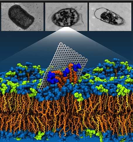 磷脂分子是组成细菌细胞膜的基本成分,它起着保护细胞质和细胞核,阻挡外界伤害该细胞的作用。研究人员通过计算机模拟结合电子显微镜技术发现,当石墨烯接触到细菌的细胞膜后,能诱导细菌细胞膜上的磷脂分子脱离细胞膜并“攀爬”上石墨烯表面。基于分子动力学模拟的理论分析揭示出,石墨烯独特的二维结构使其可以与细菌细胞膜上的磷脂分子发生很强的色散相互作用,从而实现石墨烯对细胞膜上磷脂分子的大规模直接抽取。这样,石墨烯通过物理作用杀死细菌,为开发新型抗耐药的“绿色”抗生素提供了可能,如研制以石墨烯和氧化石墨烯为原料的新型“石墨烯创可贴”等。