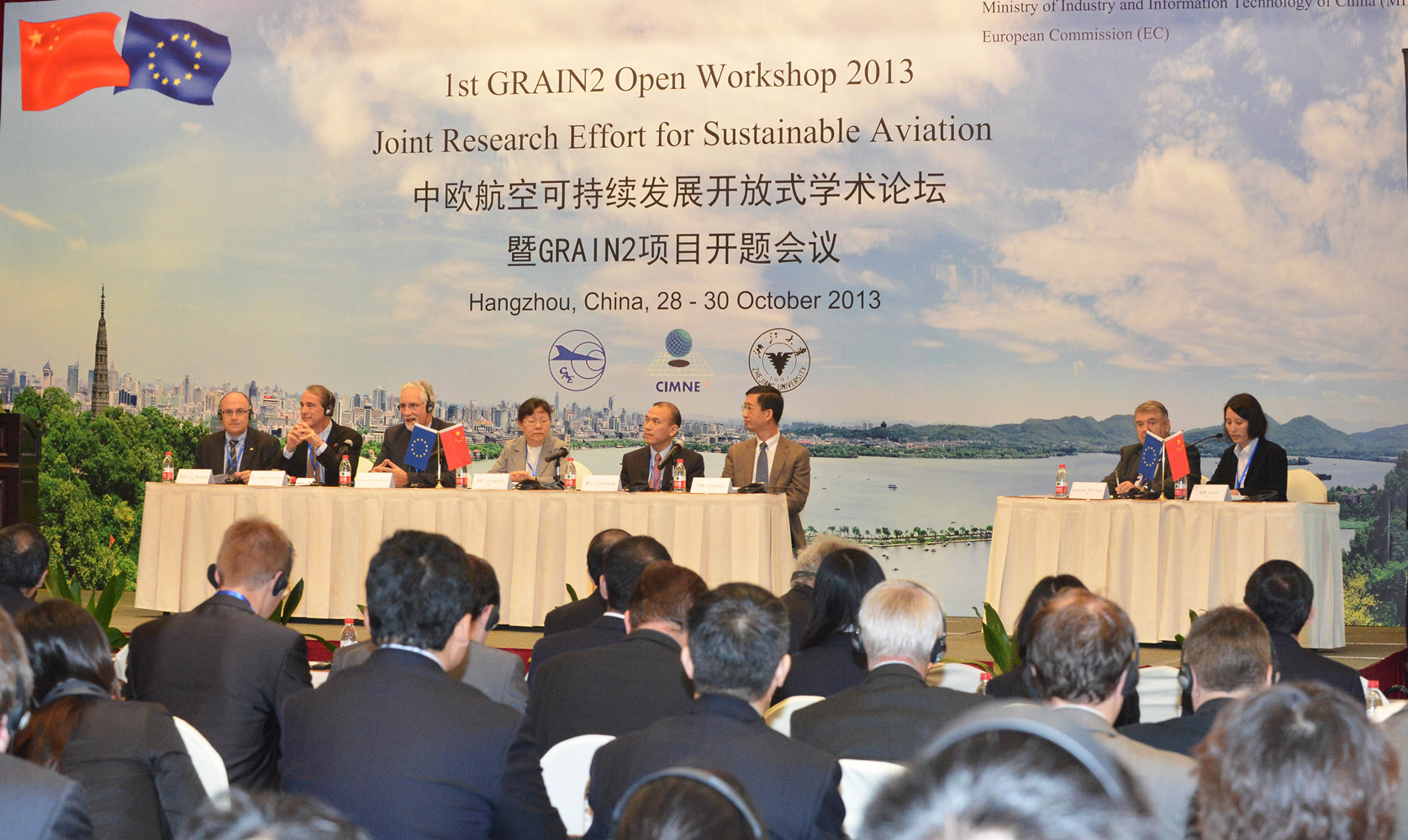 中欧航空可持续发展开放式学术论坛暨绿色航空国际交流网络平台(GRAIN2)项目开题会议于2013年10月28日在中国浙江杭州世贸君澜大饭店正式召开。此次会议由中国工业和信息化部以及欧盟委员会共同支持,由中国航空研究院、工程中数值方法国际中心(西班牙)和浙江大学共同主办。来自中欧双方46个参研单位的代表出席了会议,双方共有120位名代表参加了交流活动。会议的欢迎辞、主题演讲、引言报告、工业与研究报告均采用了中英同声传译。