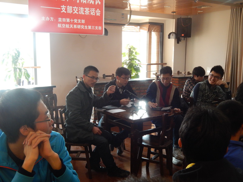 本次茶话交流会由蓝田学园第十党支部副书记叶松耸主持。本次交流会旨在通过两个支部的结对与交流,使蓝田学园第十支部的大一大二的同学们能更全面地了解航空航天学院的专业情况以及玉泉校区生活学习环境,同时开阔视野,以便更好地规划今后的学习生活。