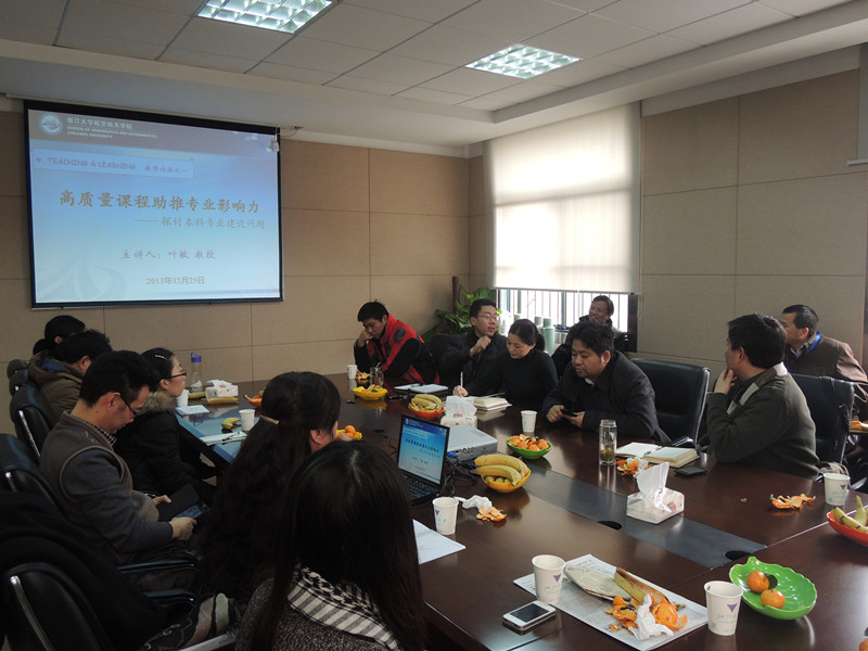 20131225日中午,航空航天学院“教与学”系列教学论坛在玉泉校区第五教学楼326会议室首次举行。论坛以主题发言和自由讨论相结合的形式进行,首次论坛邀请了工程力学系叶敏教授作题为“高质量课程助推专业影响力——探讨本科专业建设问题”的主题发言,全院30余名一线教师参加了本次交流。