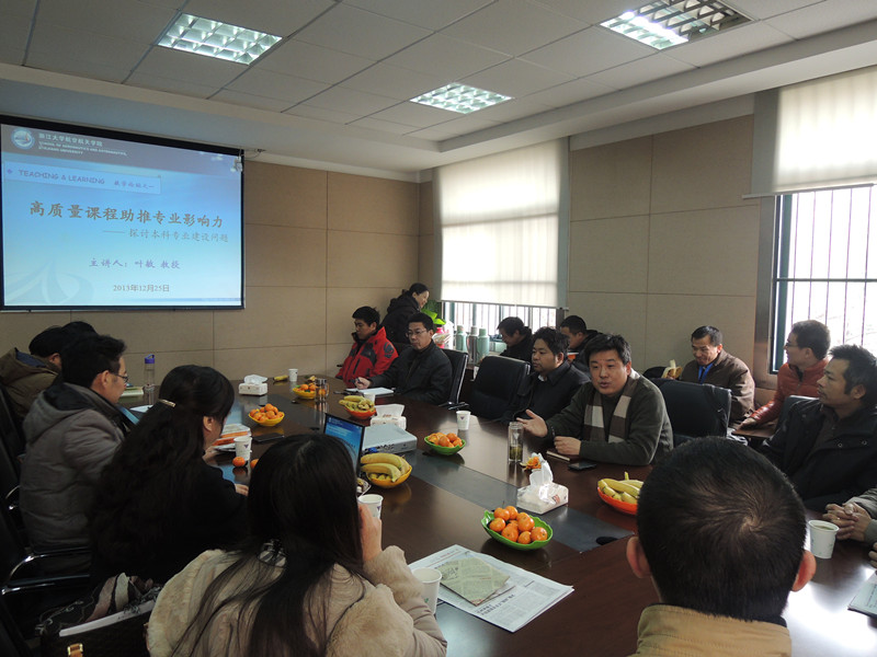 2013年12月25日中午,航空航天学院“教与学”系列教学论坛在玉泉校区第五教学楼326会议室首次举行。论坛以主题发言和自由讨论相结合的形式进行,首次论坛邀请了工程力学系叶敏教授作题为“高质量课程助推专业影响力——探讨本科专业建设问题”的主题发言,全院30余名一线教师参加了本次交流。
