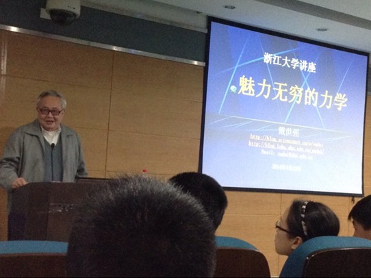 本届开幕式非常荣幸地邀请了上海大学终身教授、博士生导师戴世强教授。戴世强教授首先向我们叙述了力学的定义、特点和发展简史,强调力学在国民经济和重点单位或重点任务建设中无所不在的广泛应用;接着讲述了力学的科学美,以流体力学为例,从阳刚美、阴柔美和变易美的角度阐明力学的无穷魅力,激起了同学们强烈的学习热情。深刻的见解、睿智的话语,给学子们以无限的启发,现场不时响起热烈的掌声。最后戴教授耐心地回答了同学们的提问,并拓宽了同学们的研究思路。本届空天学术文化节开幕式在副院长邵雪明老师对戴世强教授的感谢以及对同学们的期望中结束了。