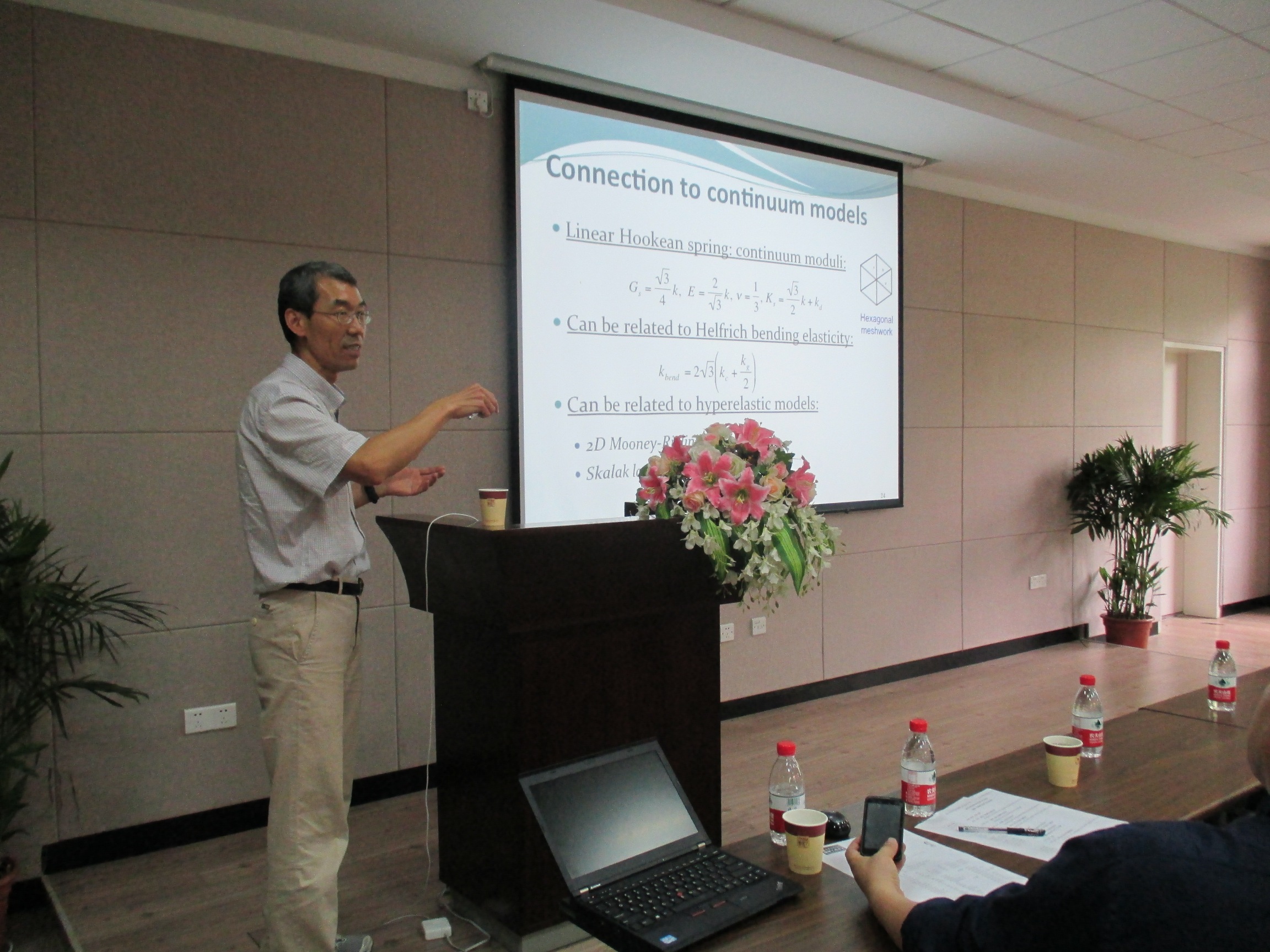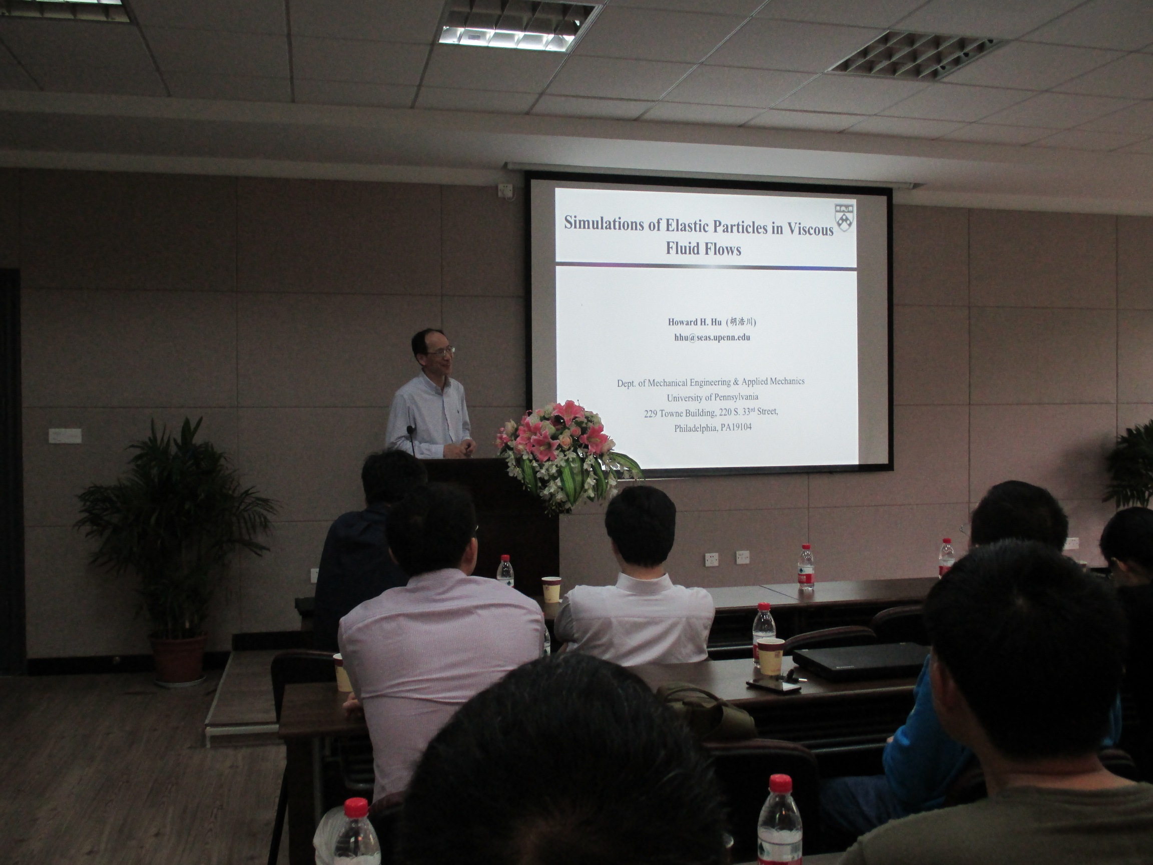 在上午的研讨会上,美国宾夕法尼亚大学Howard H. Hu教授首先介绍了采用极化方法得到的细胞等弹性颗粒在剪切流和单轴拉伸流动中的常微分控制方程组,并探讨了其基本运动特性以及在秀丽隐杆线虫运动模拟方面的应用;加拿大英属哥伦比亚大学James J. Feng教授采用理论和模拟方法,对比了疟疾感染和正常红细胞在光镊实验中的拉伸变形行为;台湾国立交通大学陈庆耀教授介绍了磁性刚体和磁流体颗粒串悬浮液在交变磁场中的运动和控制,其结果可用于改进微搅拌器的混合效率;浙江大学余钊圣教授采用虚拟区域方法研究了细胞等弹性颗粒在确定性侧向迁移装置中的运动和分离问题,系统讨论了变形率、障碍物尺寸和几何布置对于颗粒临界分离半径的影响。