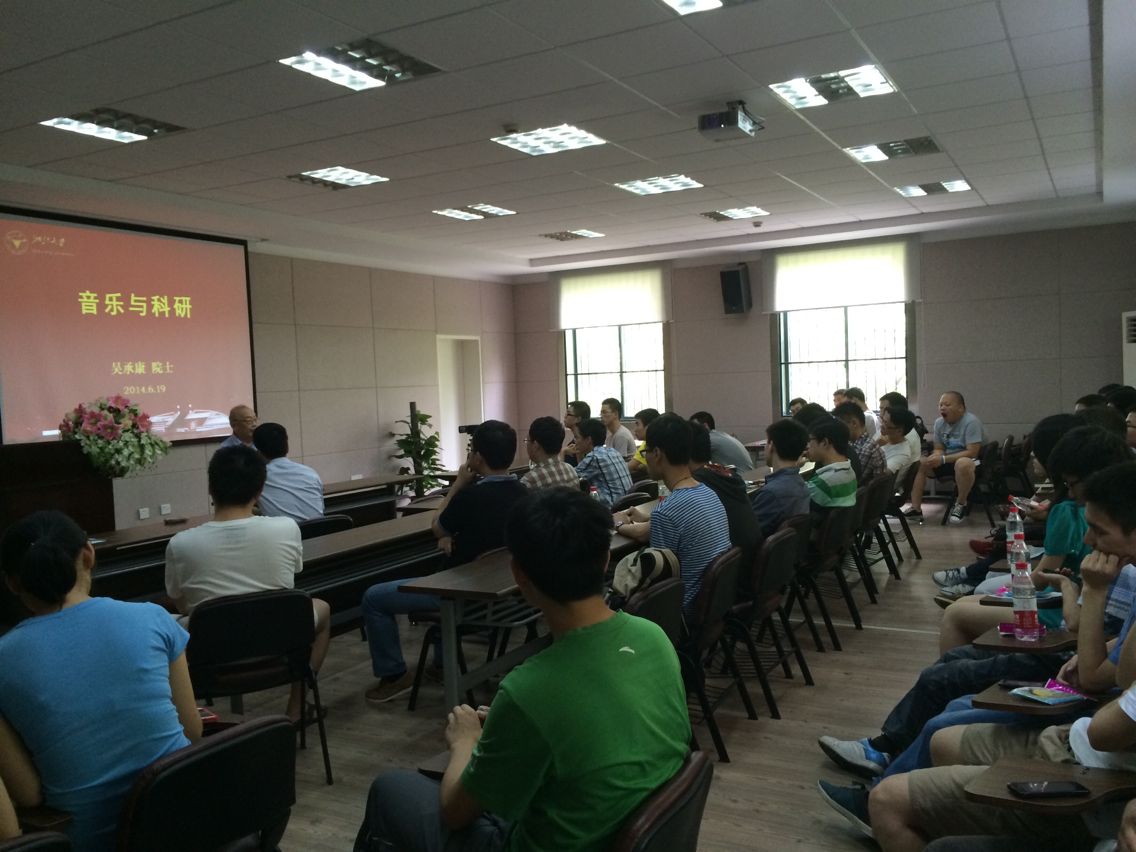 2014年6月19日下午,中科院力学所吴承康院士在玉泉校区教五333报告厅作了题为“音乐与科研”的讲座。航空航天学院党委副书记戴志潜,团委副书记秦婧雅以及各级本科生及研究生参加了此次讲座,聆听吴院士对科研和音乐的独到见解。