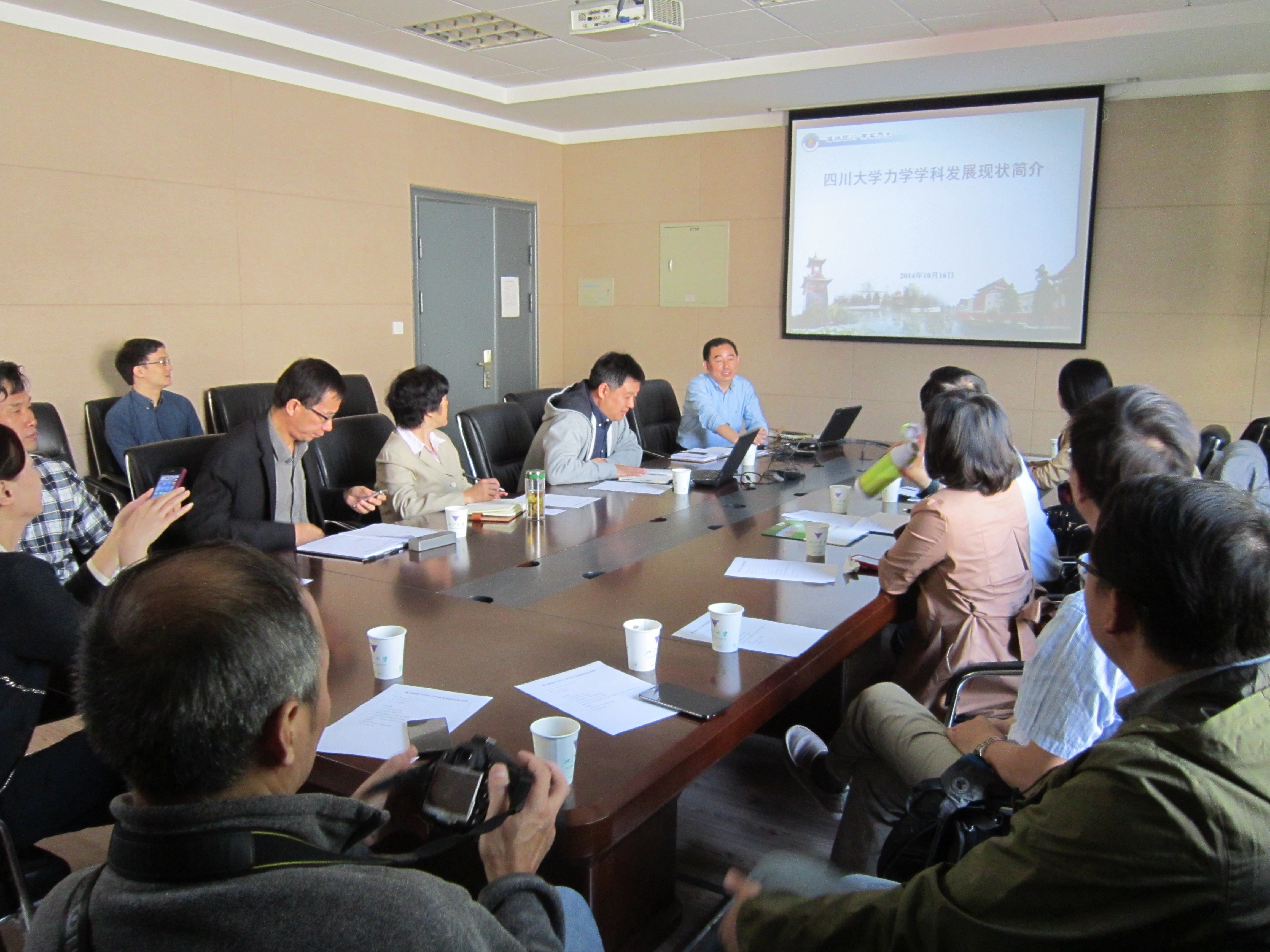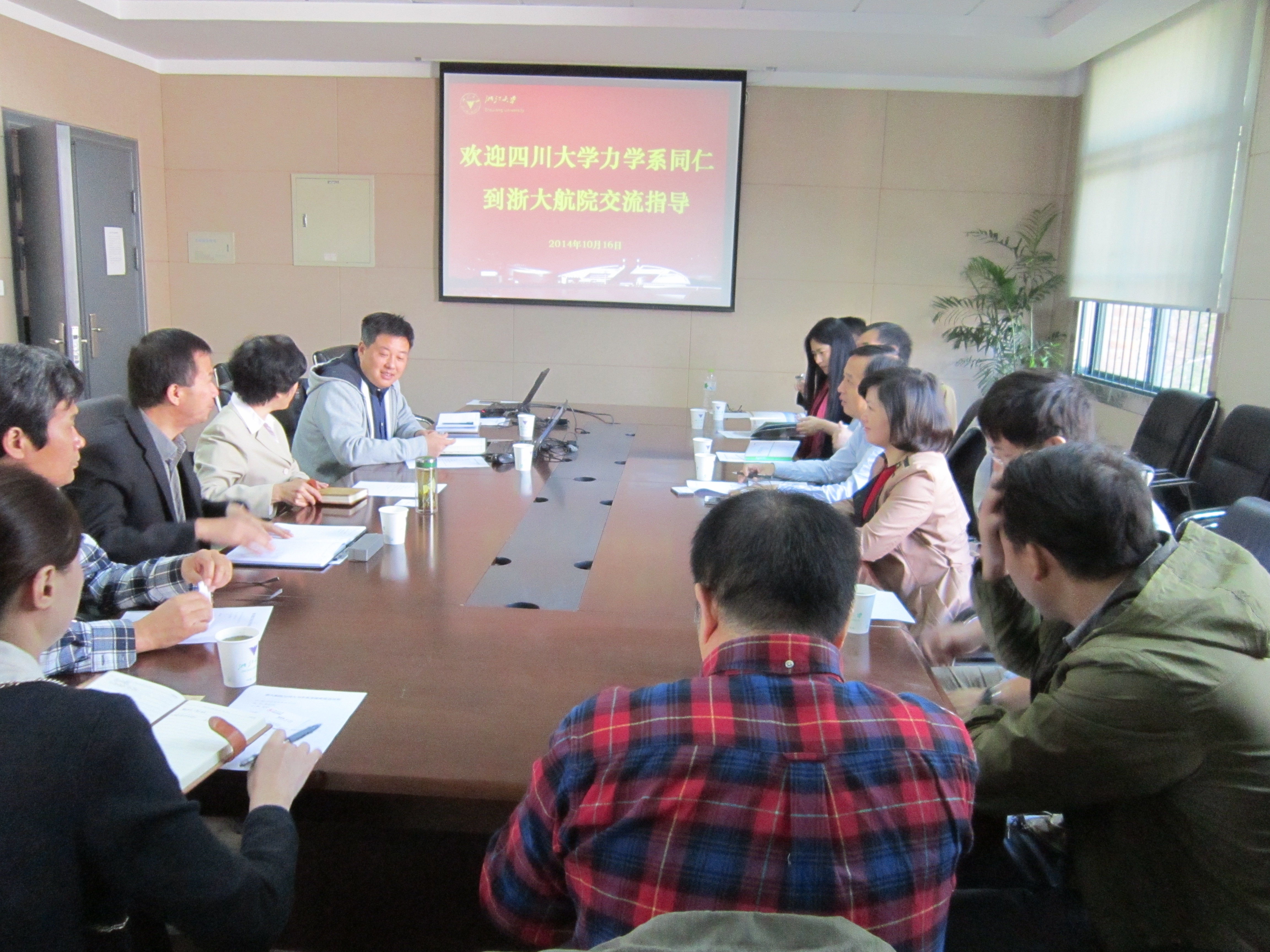 交流会由航空航天学院主持工作副院长邵雪明教授主持。航空航天学院党委书记吴丹青致欢迎词,邵雪明副院长介绍了航空航天学院的教学科研概况,力学系副系主任王惠明教授介绍了工程力学系的教学科研情况及当前的主要研究方向、研究成果和人才队伍建设等情况,力学实验中心主任李振华老师介绍了国家级实验示范中心——力学实验示范中心的情况。接着,四川大学力学科学与工程系系主任董世明教授介绍了川大的力学学科发展情况,包括学科历史、师资队伍、学科建设与资源、教学科研成果等。最后双方就如何开展自制设备的研发、人才引进的策略、本科教学的举措、力学课程的建设、学生创新能力的培养、实习基地的建设、培养方案的制定等进行了讨论交流。