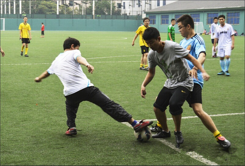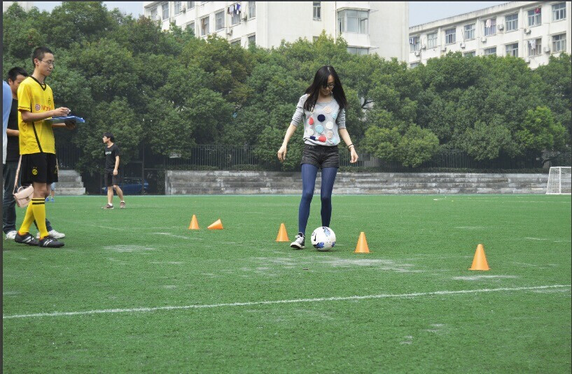 此次比赛分为两个部分:足球娱乐活动和足球赛正式比赛。首先进行的是足球娱乐活动——绕桩射门。在一片欢乐之中,参赛的各位球员展示了自己的速度和技术,尤其是女子组中,常若菲和雷军霞两位同学,那一拨,一带,一射,有板有眼,更是巾帼不让须眉。
