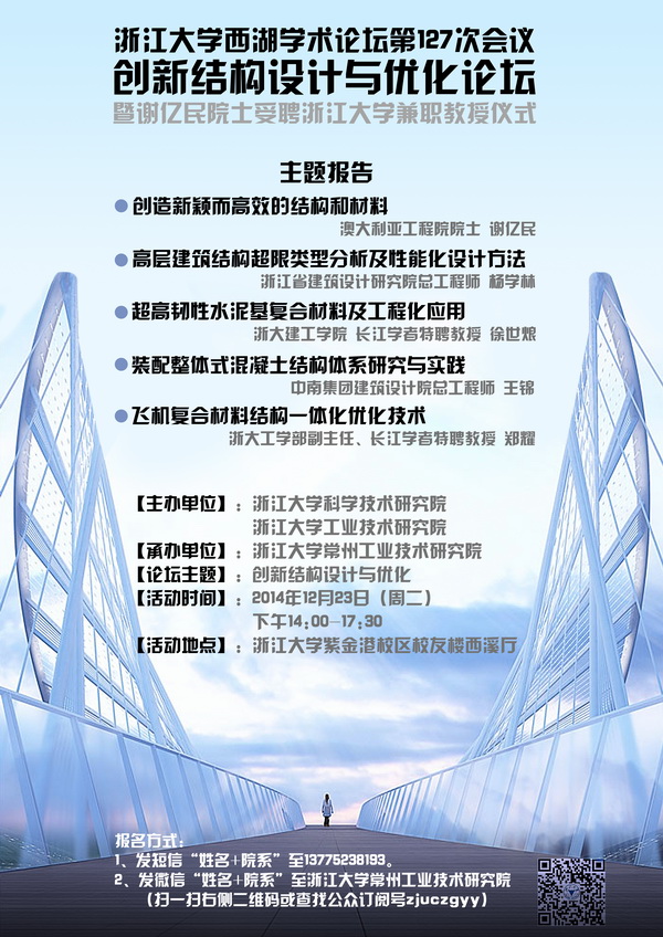 “浙江大学西湖学术论坛第127次会议--创新结构设计与优化”定于2014年12月23日下午在紫金港校区举办。论坛将邀请国内外知名大学和建筑设计单位的专家参会研讨,促进浙江大学在结构工程领域的创新、研发及合作。论坛主题报告开始前举行澳大利亚工程院谢亿民院士受聘浙江大学兼职教授仪式。