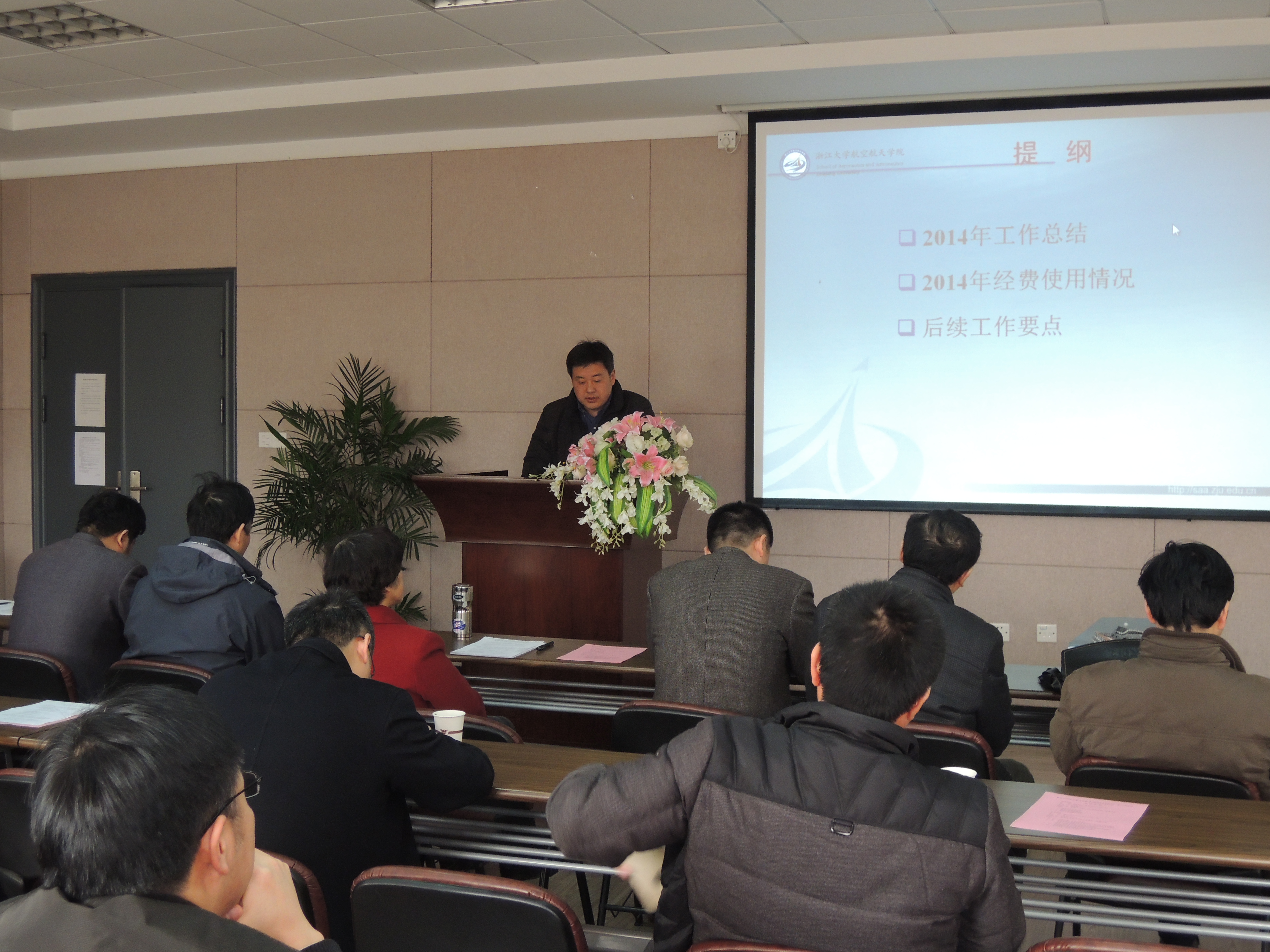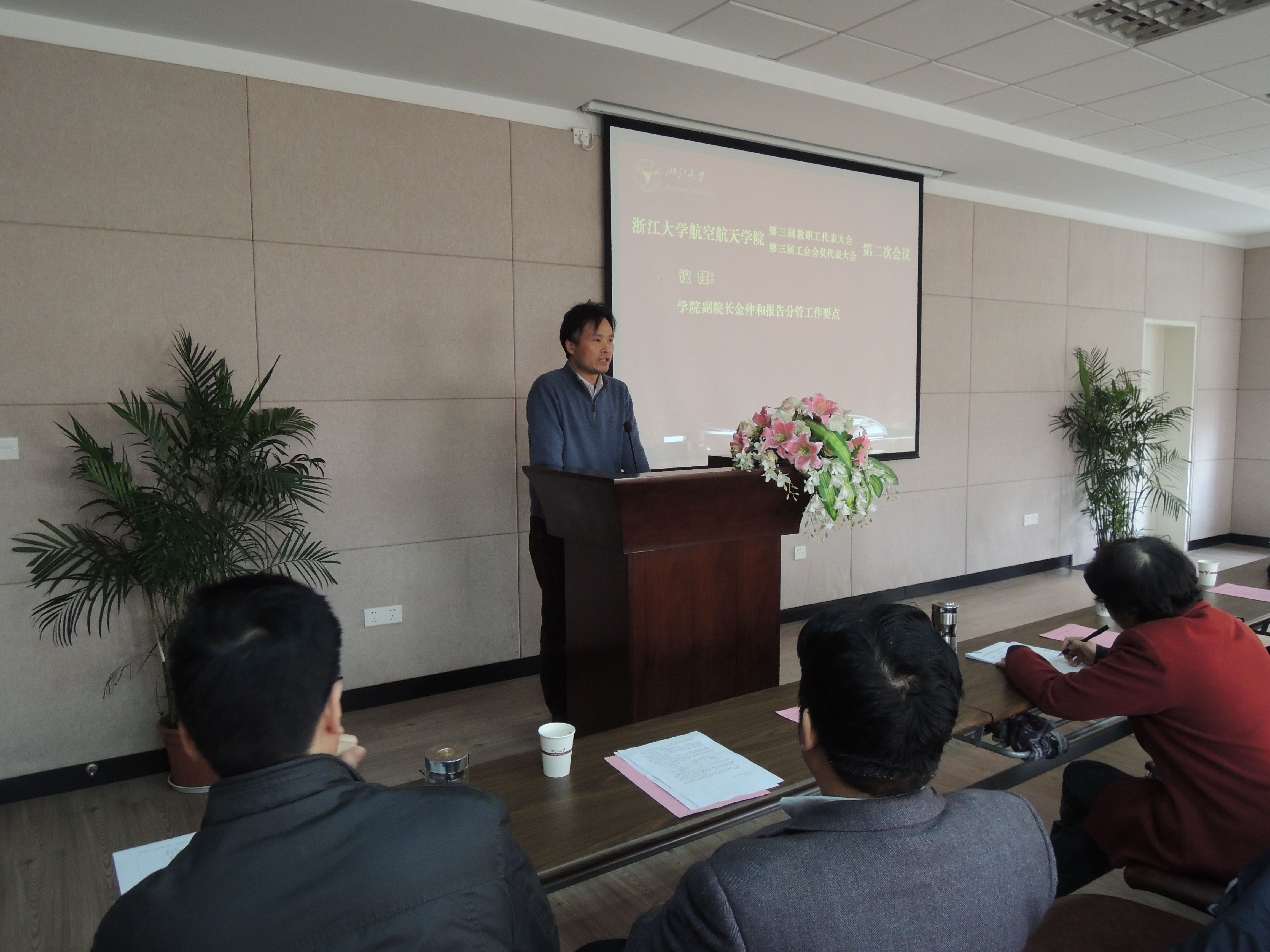副院长邵雪明教授代表学院党政班子向大会作了学院2014年工作总结及后续工作要点报告。他从学院师资队伍建设、教育教学、科学研究、学生工作、党建工作、发展联络等多方面总结了学院过去一年来所取得的成绩,并报告了学院经费使用情况,围绕学院学科与人才队伍建设方案,详细介绍了2015年学院在队伍建设、人才培养、学术研究和机制体制改革与学术环境建设方面的后续工作要点。会议审议通过了《航空航天学院教学科研用房管理实施细则》。学院副院长黄志龙教授和金仲和教授分别围绕研究生培养和科学研究等工作作了专题报告。