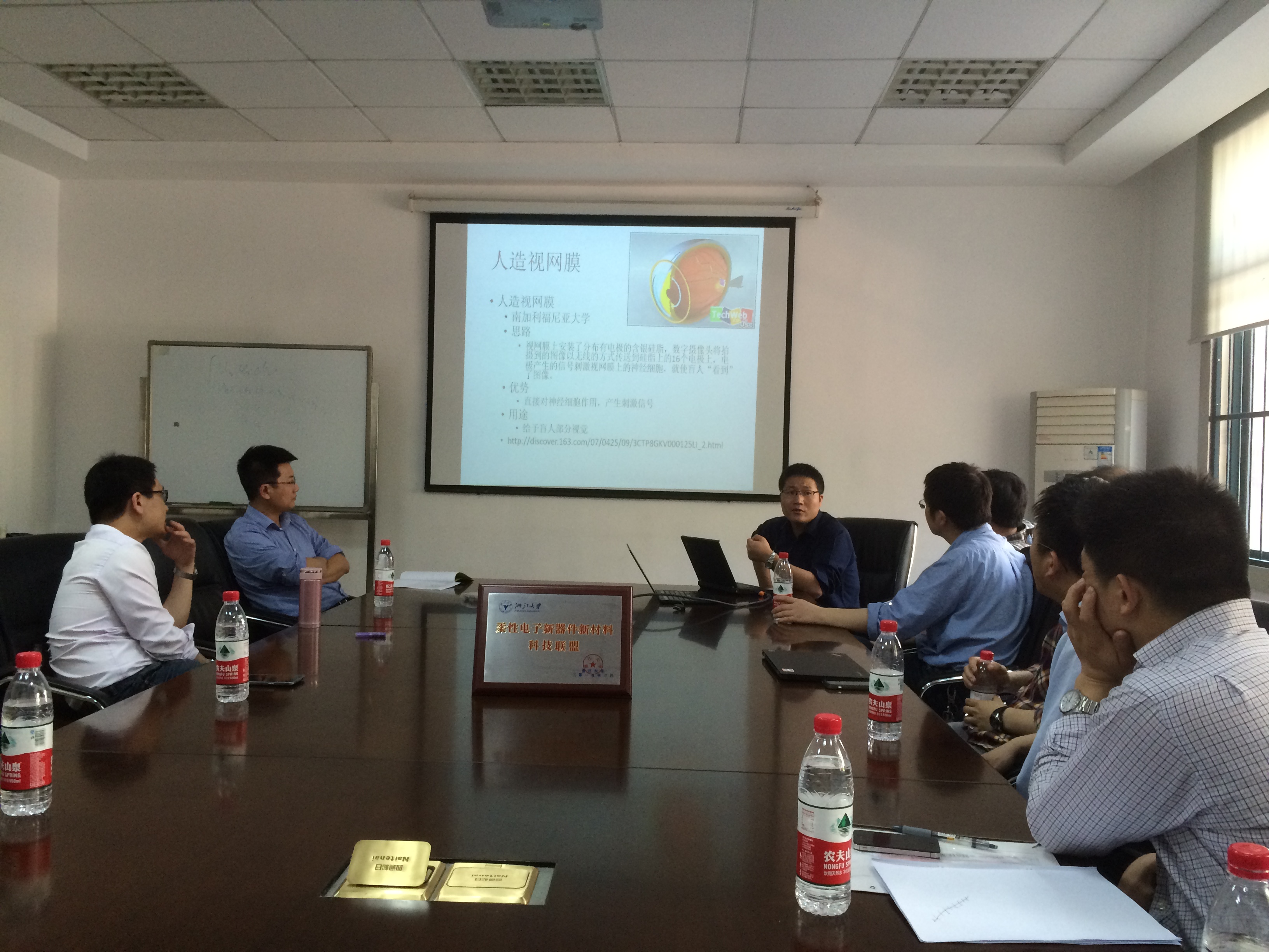 浙江大学柔性电子新材料新器件科技联盟第二次会议于2015年4月28日下午在玉泉校区教五212房间举行。包括联盟成员陈伟球、曲绍兴、吕朝锋、宋吉舟、李铁风、罗英武、董树荣、李石坚和张韶岷老师等,以及特邀参加本次会议的浙一泌尿科王平、楼国光和罗金丹医生与浙一神经外科潘剑威医生,科研院谢崇波老师也应邀参加了会议和讨论。