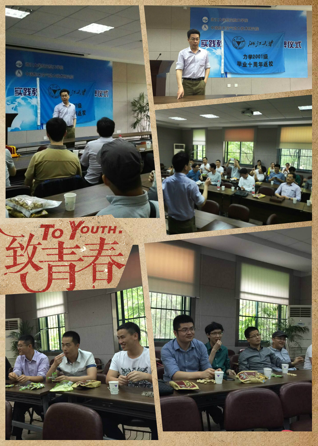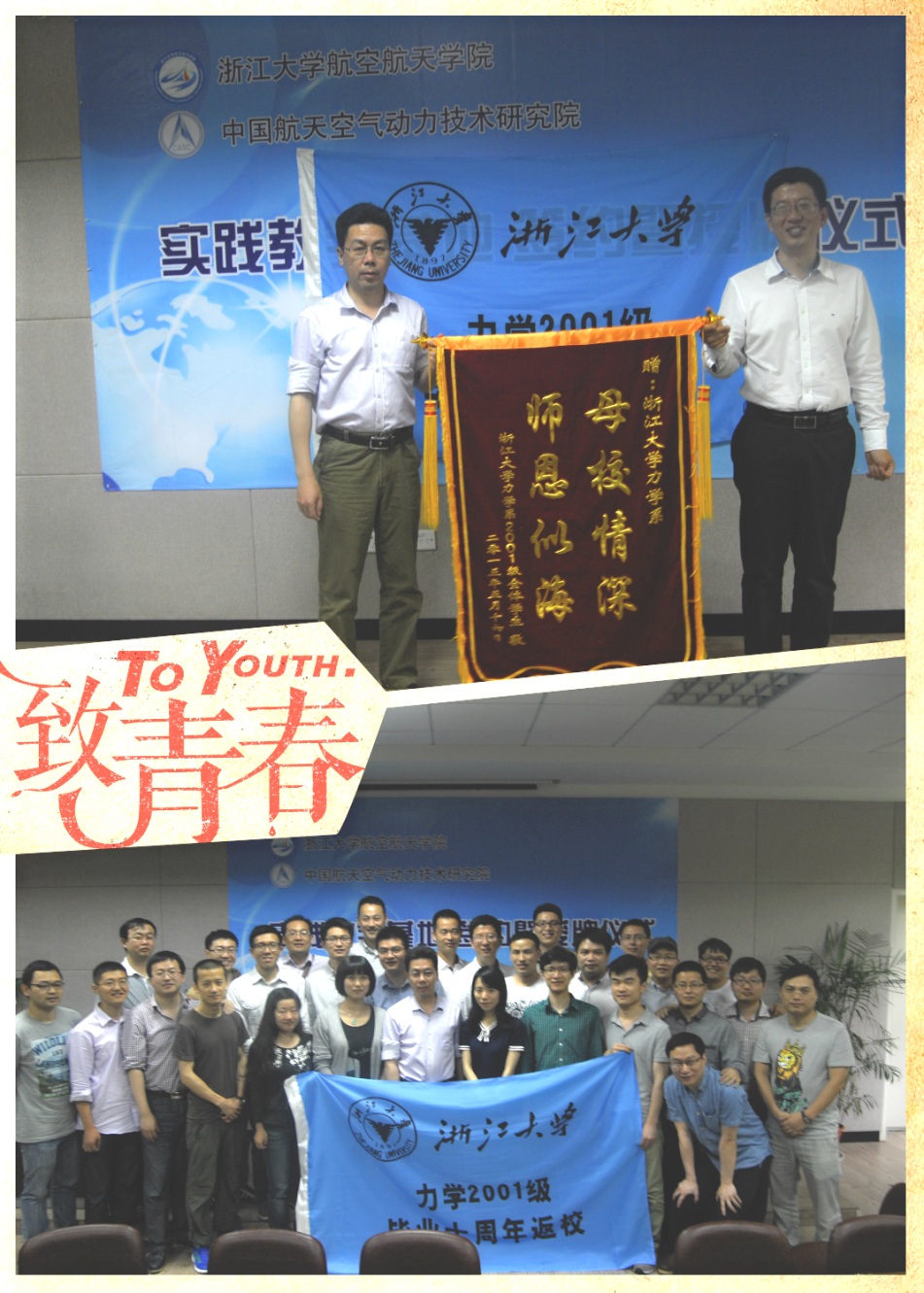 2015年5月16日,工程力学专业2001级的29位校友在毕业十周年后,重返西子湖畔、老和山下,共叙分别意、畅谈阔别情,并向系里赠送了“母校情深、师恩深重”的锦旗。力学系所在的航空航天学院党委副书记、工程力学专业2001级班主任戴志潜老师一同参加了本次活动。