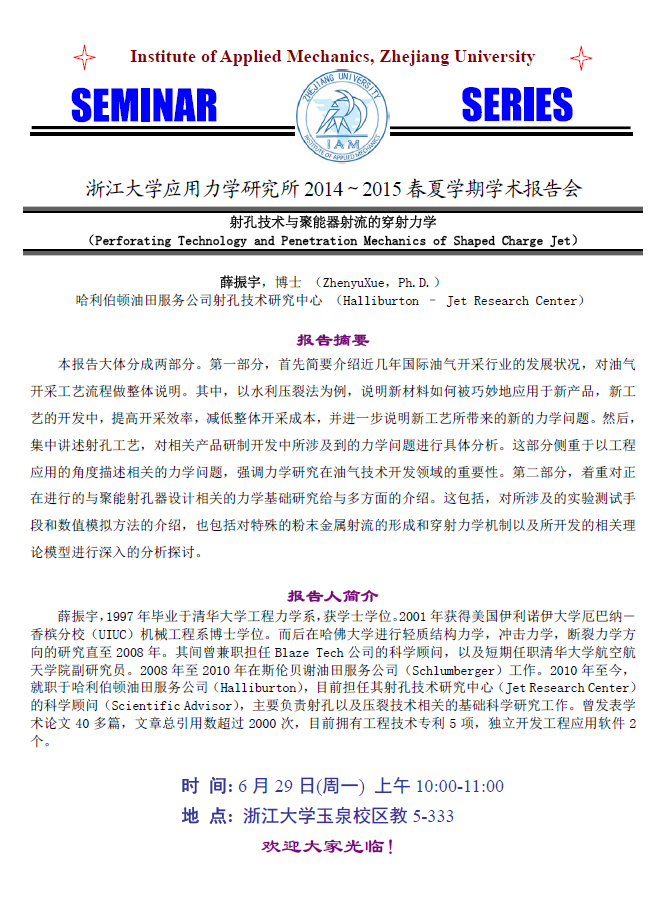 关于哈利伯顿油田服务公司射孔技术研究中心薛振宇博士学术讲座的通知