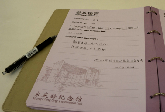 参观宋庆龄纪念馆后留言:“鞠躬尽瘁,死而后已!扬我国威,立志兴邦!——浙江大学航空航天学院社会实践团”