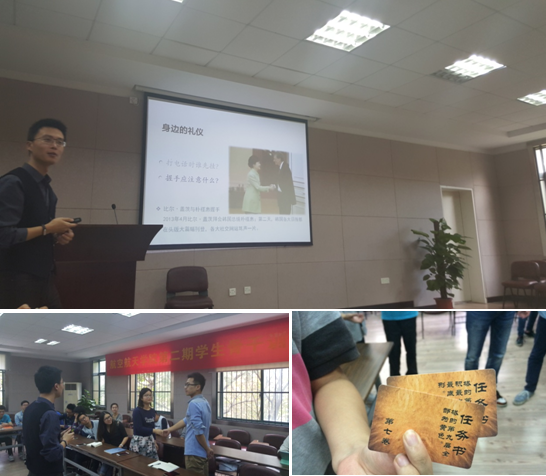 11月7日,学生骨干训练营邀请了公共管理学院团委书记卓亨逵老师和动物科学学院陈卫老师分别作了“德礼相济 博雅修身—学生干部礼仪”和“团队建设与沟通”的专题培训。两位老师用轻松的体验式培训方式,亲身示范和学生互动,达到了很好的效果。