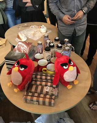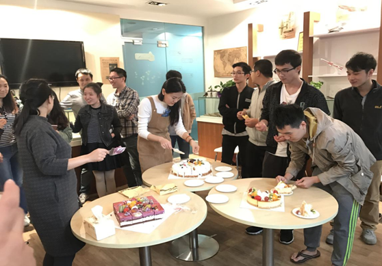 随后大家互送祝福,合唱生日歌后开始分享精美的生日蛋糕。最后,老师和同学们都挑选好了心仪的生日礼品,生日会在轻松欢快的氛围落下帷幕。
