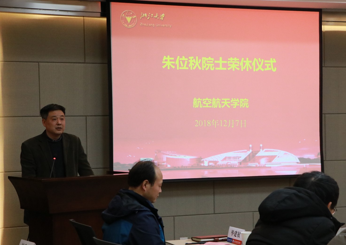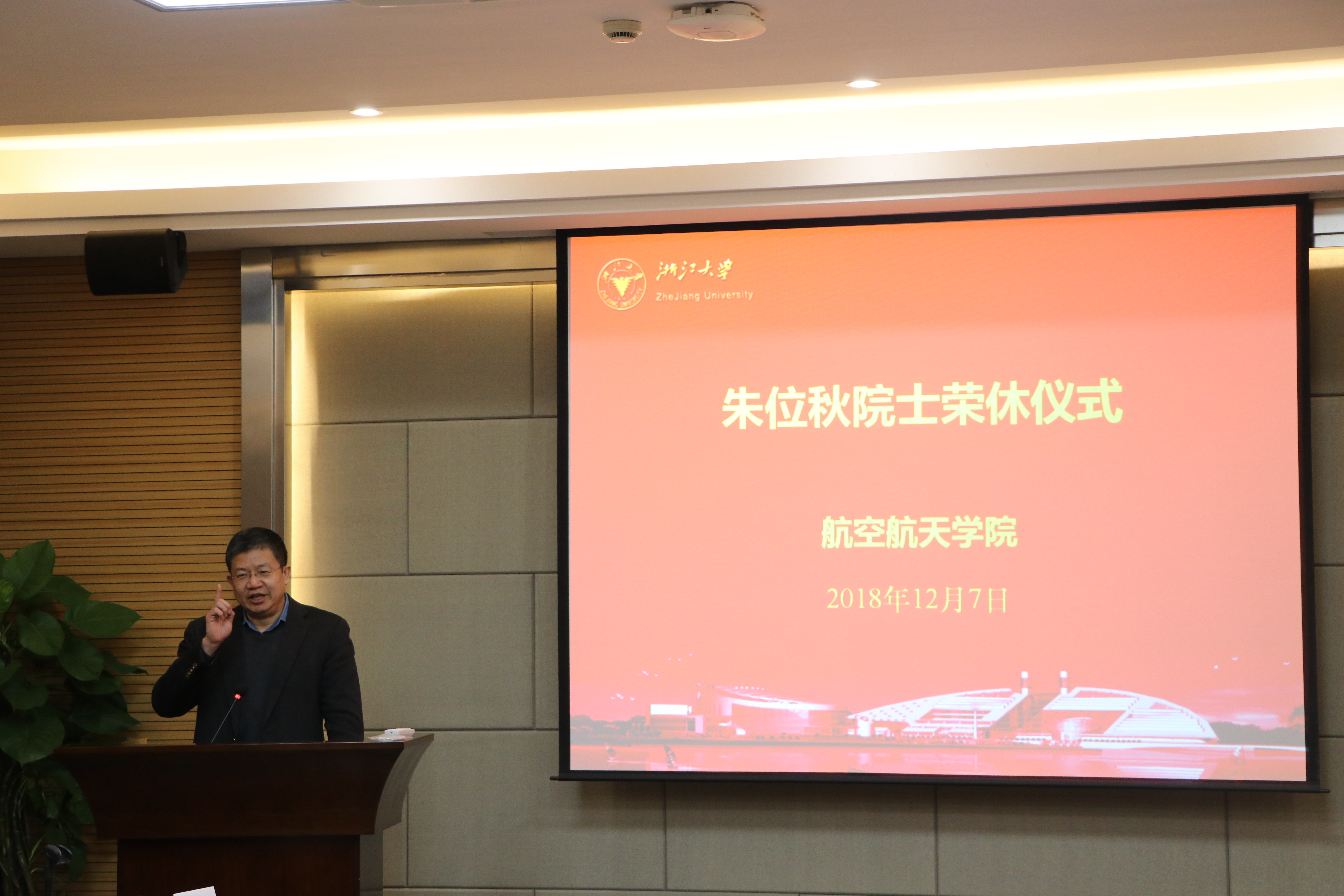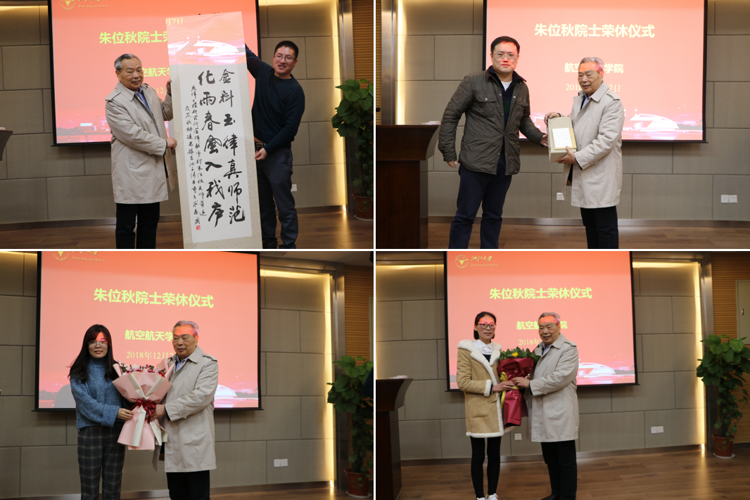 朱院士感慨万千,在发表荣休感言时,他由衷地感谢浙大、感谢航院、感谢前来参加荣休仪式的每一位师生。他分享了在浙大工作43年来的点点滴滴,并谈了四点体会:一是人生的道路上会有很多岔路口,我们一定要选择好适合自己的方向。二是要培养好的学生,一定要有好的教师来上课,要重视教学工作。三是要真正做好学问,必须要有自己的学术思想,去发明、发现和创造。四是年轻教师要积极与国际知名教授开展合作。他还语重心长地说,“希望航院教师能够把学问做好,把课上好。”最后,他还表示,仍然会一如既往地关心支持学院发展。