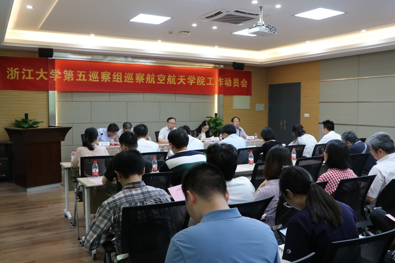 2019年5月27日下午,浙江大学第五巡察组巡察航空航天学院工作动员会在玉泉校区第五教学大楼召开,这标志着为期两周的对航空航天学院巡察工作正式启动。校党委常委、党委组织部部长、党委统战部部长包迪鸿,校纪委副书记、巡察办主任叶晓萍,第五巡察组组长翟国庆及巡察组全体成员,航空航天学院领导班子成员、党委委员、纪委委员和内设机构负责人、教职工代表、离退休教师代表、学生代表等70余人参加会议。
