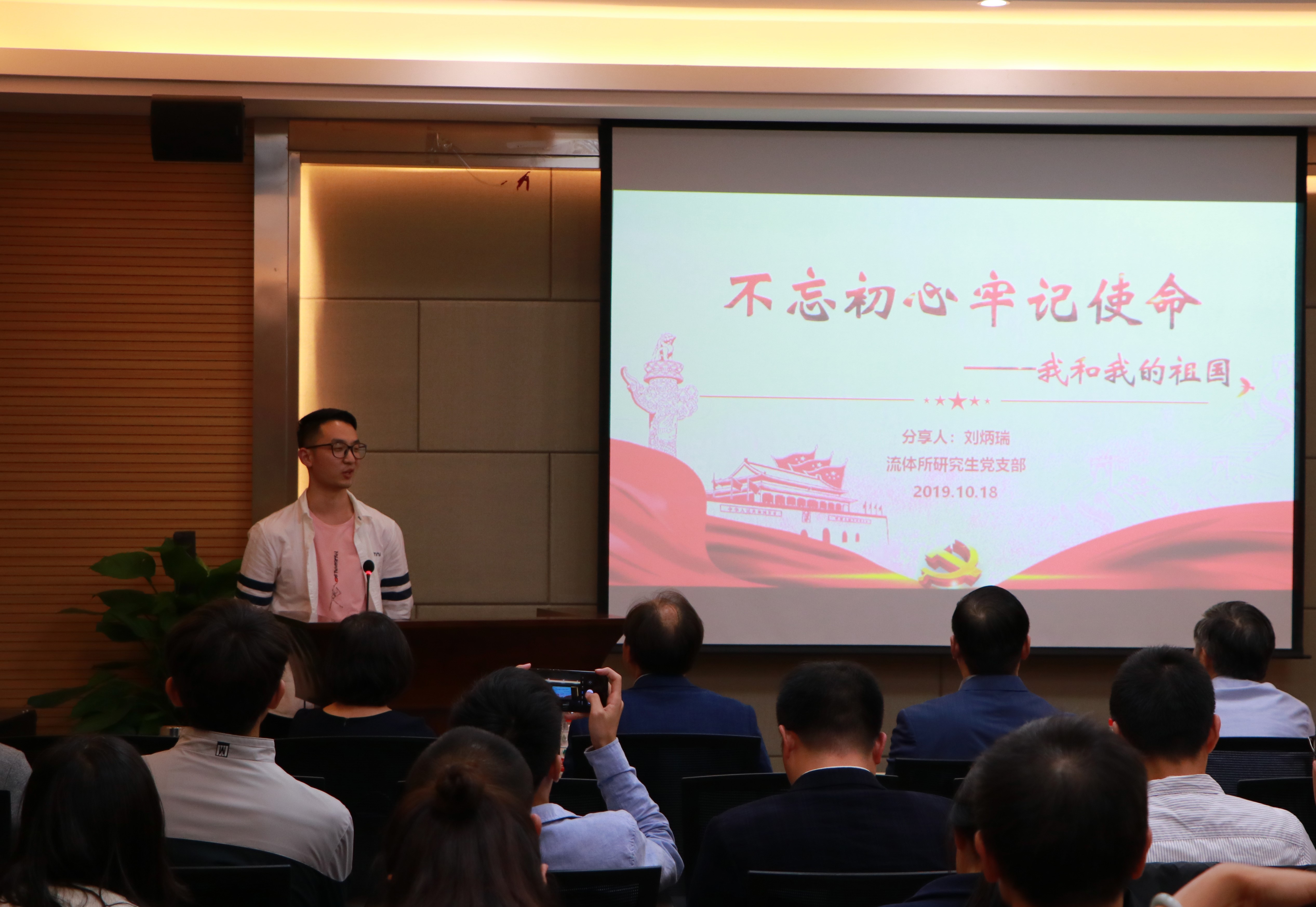 作为学生党支部书记的刘炳瑞,以“不忘初心,牢记使命——我和我的祖国”为主题,以一名学生党员的身份,从祖国和平、教育、经济上取得的进展上,论述了共产党人的初心和使命。在最后,刘炳瑞同学引用了总书记对青年的寄语“以国家富强、人民幸福为己任,胸怀理想、志存高远,投身中国特色社会主义伟大实践,并为之终生奋斗”来勉励在场党员同志。