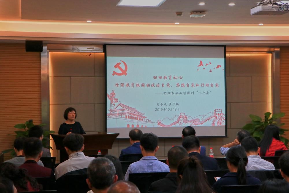 吴红瑛处长首先上台为大家上党课,吴处长结合自己曾经在教学一线的教学经历以及作为一名学生家长的经历,讲述了主题为“回归教育初心——增强教育报国的政治自觉、思想自觉和行动自觉”的主题报告,吴处长在报告中指出要做到考核评价导向正确,解决指挥棒问题;坚持把教师队伍建设作为基础工作,解决教育者本身的问题;努力构建德智体美劳全面培养的教育体系,解决重知识传教,轻能力素质和人格培养的问题。