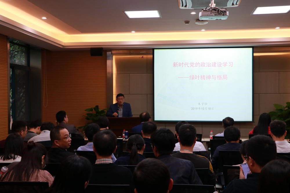 随后,总务处党支部书记朱宇恒上台讲解了主题为“新时代党的政治建设学习——绿叶精神与格局的党课报告,朱老师强调了新时代党的政治建设的首要任务和举措,要坚定“两个维护”,做到增强“四个意识”、坚定“四个自信”、坚持“四个服从”;同时强调了新时代党的政治建设的统领地位。在最后,朱老师提倡在工作学习中我们要坚持绿叶精神,乐于奉献,忠诚担当。
