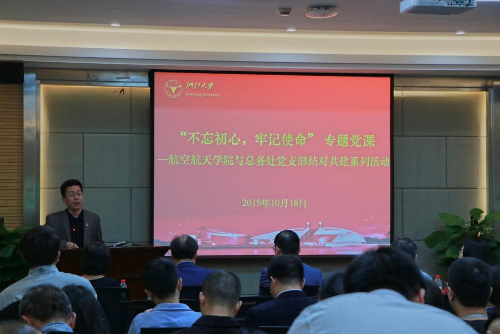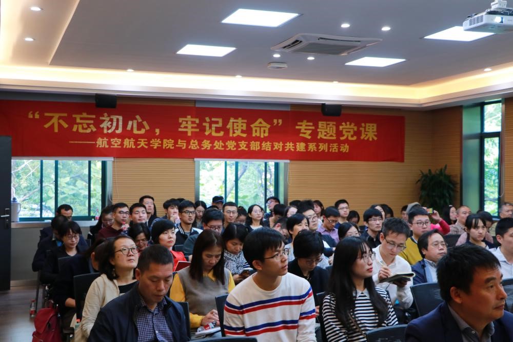 为学习贯彻习近平总书记在“不忘初心、牢记使命”主题教育工作会议的重要讲话精神,深刻领会总书记关于党的初心和使命的重要论述,10月18日下午,“不忘初心,牢记使命”专题党课活动在教五333会议室举行。此次活动是航空航天学院与总务处党支部结对共建系列活动的重要内容。活动邀请总务处处长吴红瑛、总务处党支部书记朱宇恒、航空航天学院党委书记毕建权、航空航天学院党委副书记戴志潜和流体所研究生党支部书记刘炳瑞上台为党员同志讲党课。本次专题党课由戴志潜主持,三个党支部全体党员、预备党员和积极分子80余人参加了本次活动。