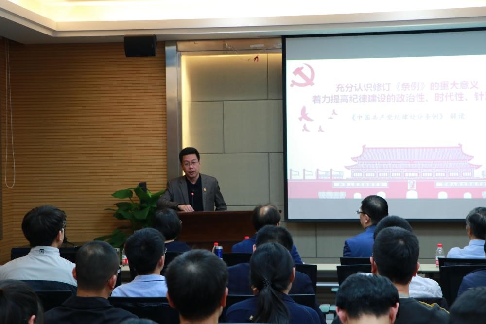 最后,由航空航天学院党委副书记、纪委书记戴志潜老师上台为大家讲党课,戴老师结合自己的工作经历,细致的为大家解读修订《中国共产党纪律处分条例》的重大意义,就是着力提高纪律建设的政治性、时代性、针对性。戴老师详细的讲解了《条例》的有关内容,特别指出《条例》最鲜明的特点就是进一步细化和严明了政治纪律和政治规矩,把纪律建设的政治性提升到了一个新高度。