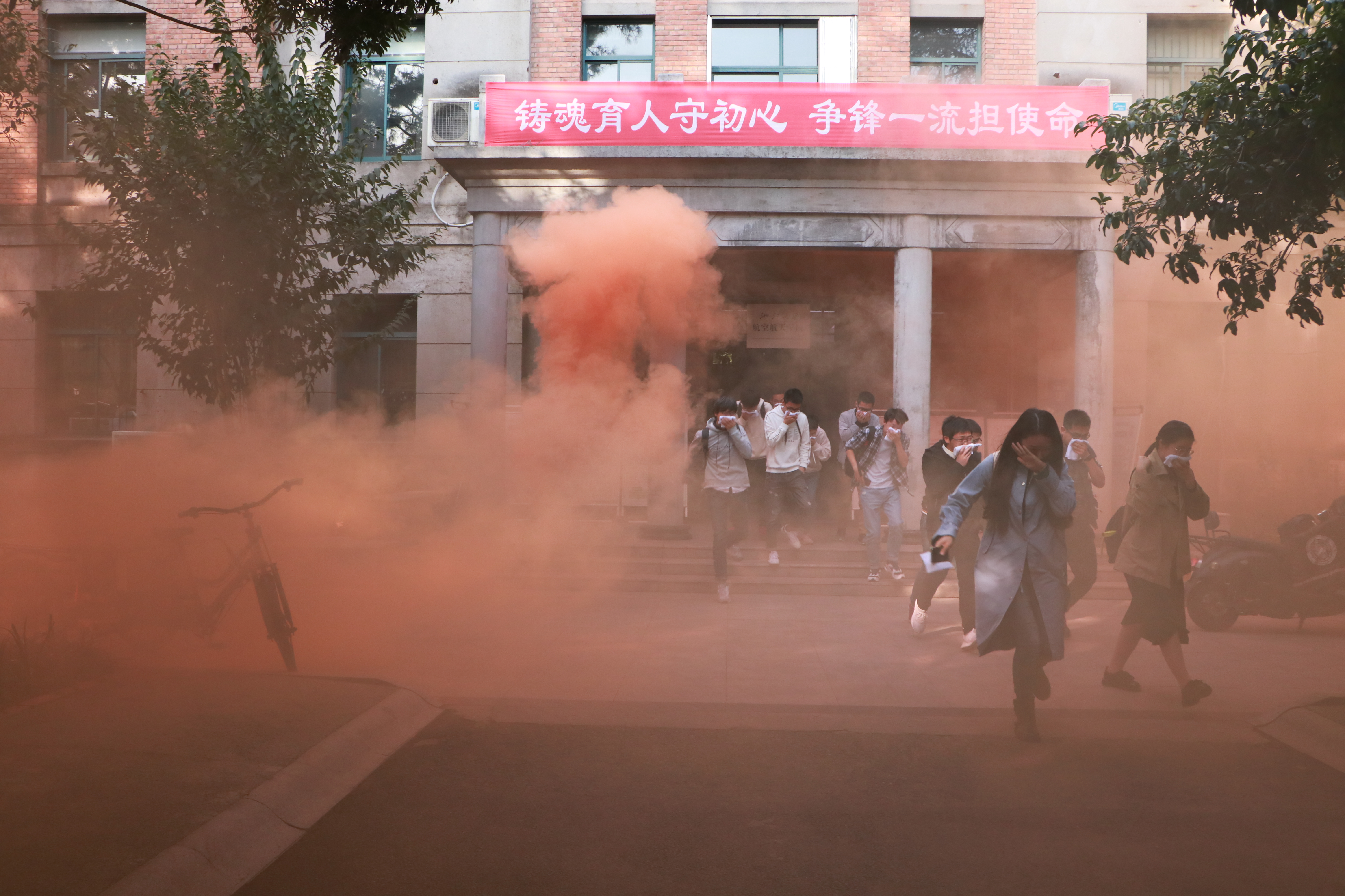 在应急疏散环节,当警报声响起,教五楼里的师生员工,迅速做出反应,用湿毛巾捂住口鼻,在楼层疏散员的引导下,有序地撤离到安全地点。灭火演练环节,玉泉校区保卫办主任陈忠云详细讲解了灭火器的使用方法,并强调了使用过程中的注意事项,大家踊跃而有序地进行了灭火演练。