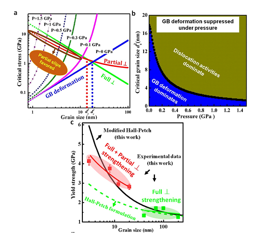 图2. 激发晶界形变的临界应力、临界晶粒尺寸与压力之间的定量关系,以及基于修正Hall-Petch关系的屈服强度尺寸效应的预测。