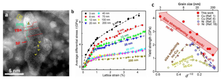在此次研究中,上海高压科学研究中心的周晓玲博士和许家宁博士利用金刚石压砧(diamond anvil cell)和径向X射线衍射方法,测量在高压环境中多种晶粒尺寸的纯金属镍的偏应力随晶格应变的变化关系、以及屈服应力与晶粒尺寸的定量关系,如图1所示,发现超细金属镍(晶粒尺寸为3nm)的屈服强度达到4.2GPa,是常用金属镍的10倍,最大流应力可以达到10.2GPa;重庆大学材料科学与工程学院的冯自强博士等通过扫描电镜观察到在3nm晶粒内部存在的位错、层错和孪晶。