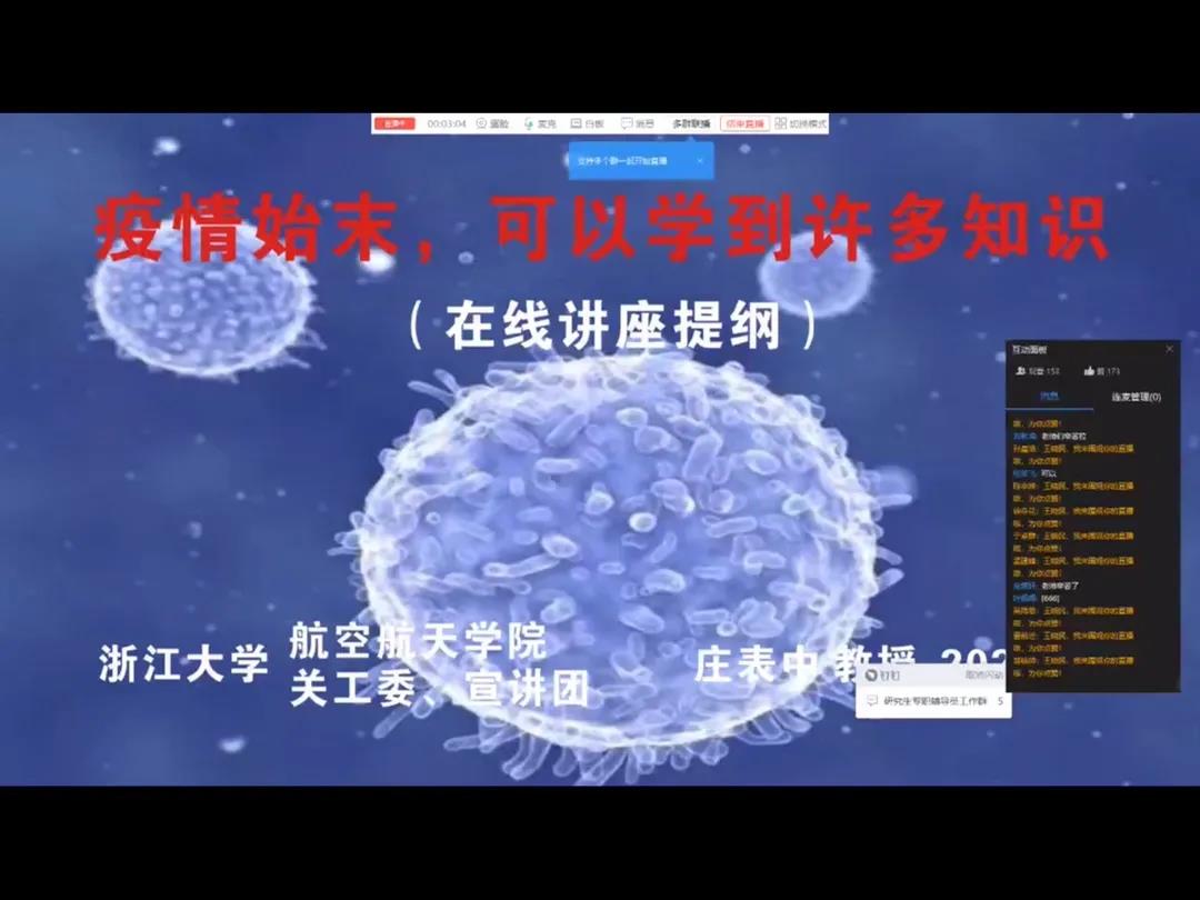 2020年4月10日,航空航天学院通过浙大钉直播平台开展线上党课。86岁高龄的浙江大学关工委宣讲团成员、航空航天学院退休教师庄表中教授主讲,党员、预备党员及入党积极分子共计260余人集聚云端,共同聆听“疫情始末,可以学到许多知识”主题党课,共话新时代党员使命担当。