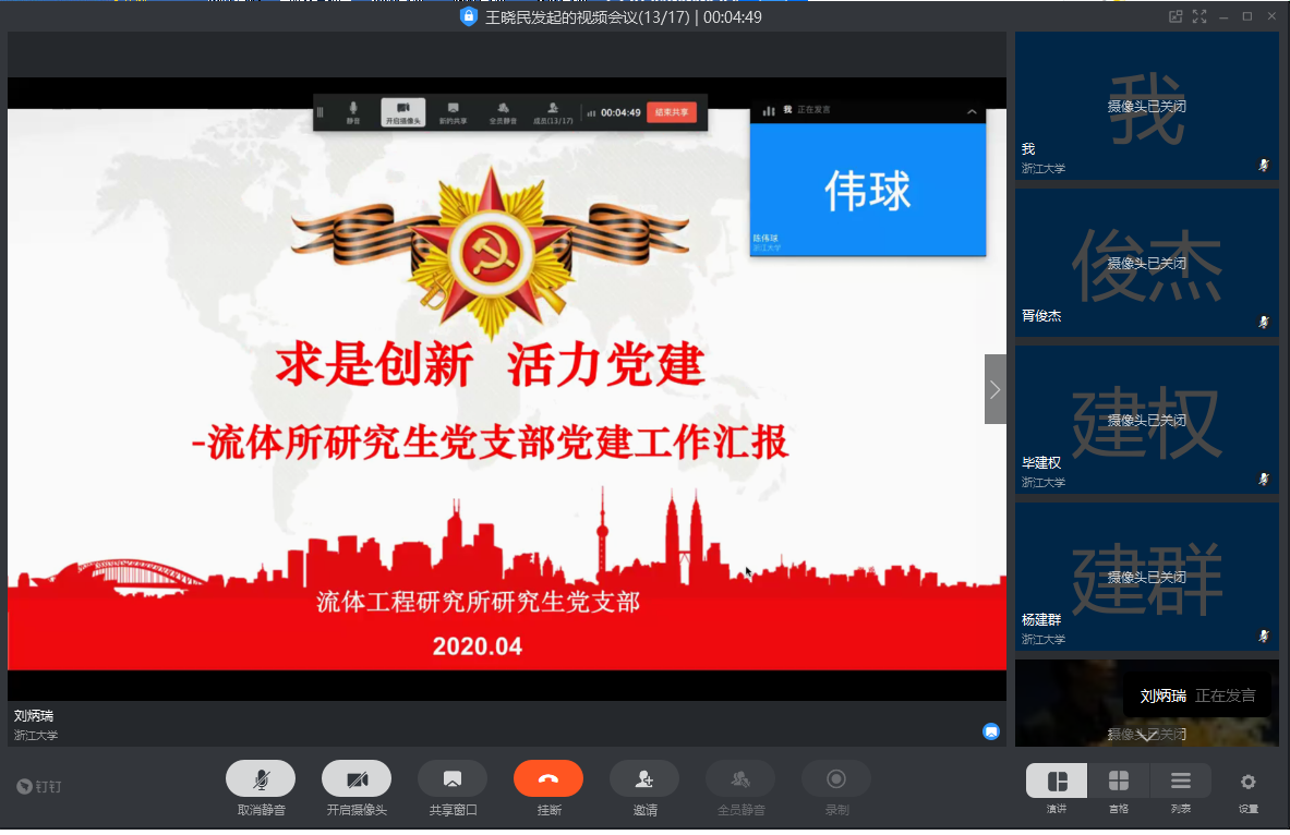 为深入贯彻落实习近平新时代中国特色社会主义思想和党的十九大精神,按照新时代党的建设总要求,根据《中共浙江大学委员会关于开展新时代基层党组织党建示范创建和质量创优工作的通知》(党委发〔2019〕18 号)文件精神,航空航天学院党委于4月26日通过浙大钉召开线上“全校党建工作样板支部”建设验收会,对流体工程研究所研究生党支部建设情况进行初审。学院党委委员、党支部书记等近20人参会。会议由学院党委副书记戴志潜主持。