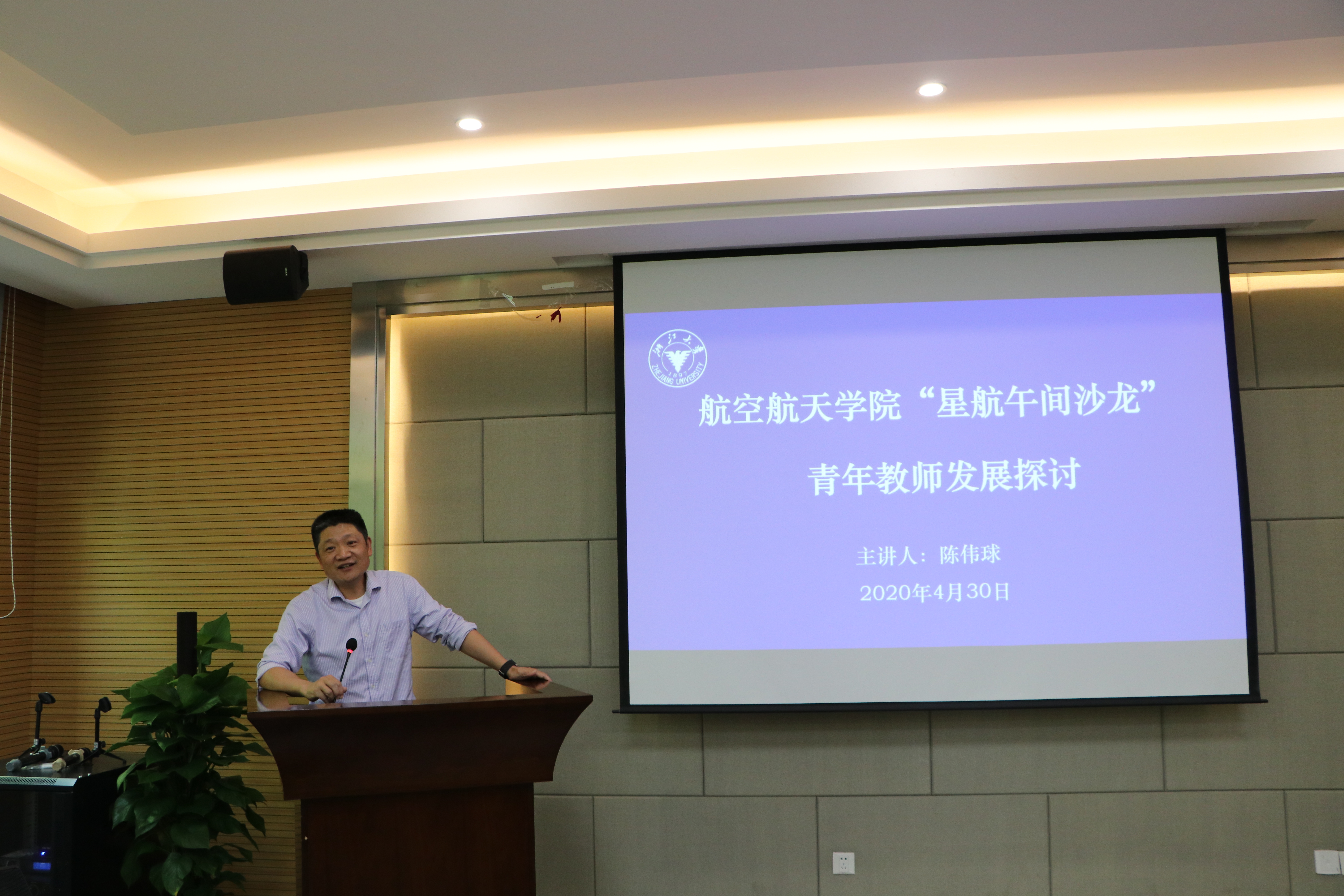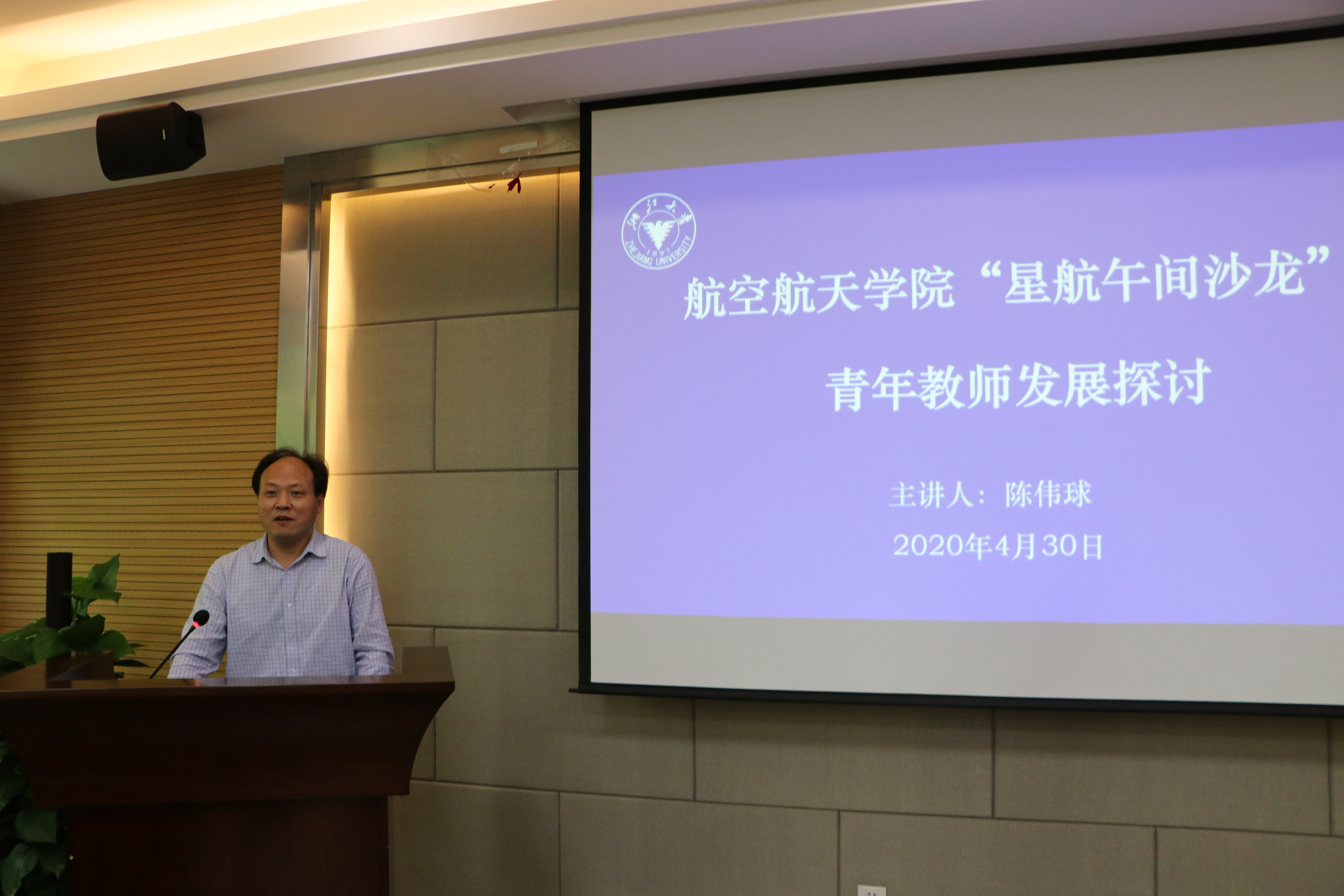 4月30日中午,航空航天学院“星航”午间沙龙第三期活动在玉泉校区第五教学楼333会议室顺利举行。“星航”午间沙龙是学院教职工围绕科学研究、教育教学、教师发展、文化营造等主题开展研讨的交流互促平台。本次活动邀请学院常务副院长、长江特聘教授陈伟球作“青年教师发展探讨”的主题报告,活动由党委书记毕建权主持,学院共30余名青年教师和机关工作人员参加了活动交流。