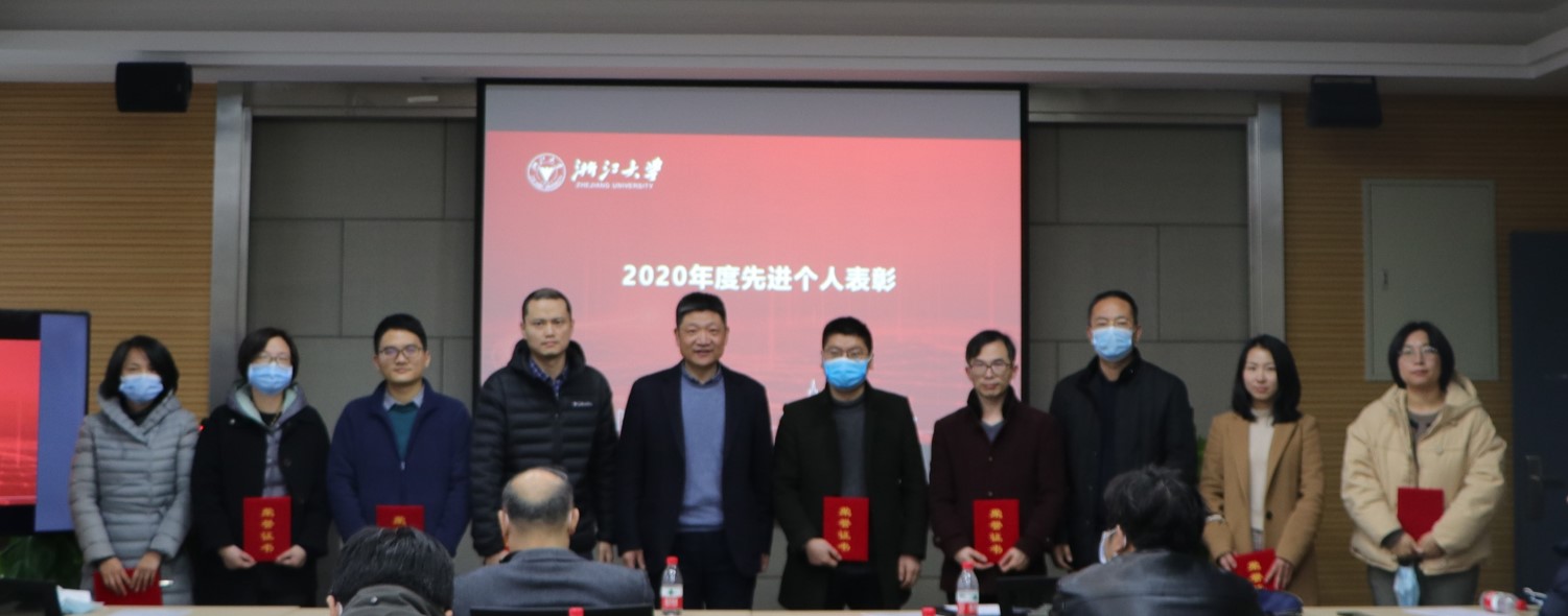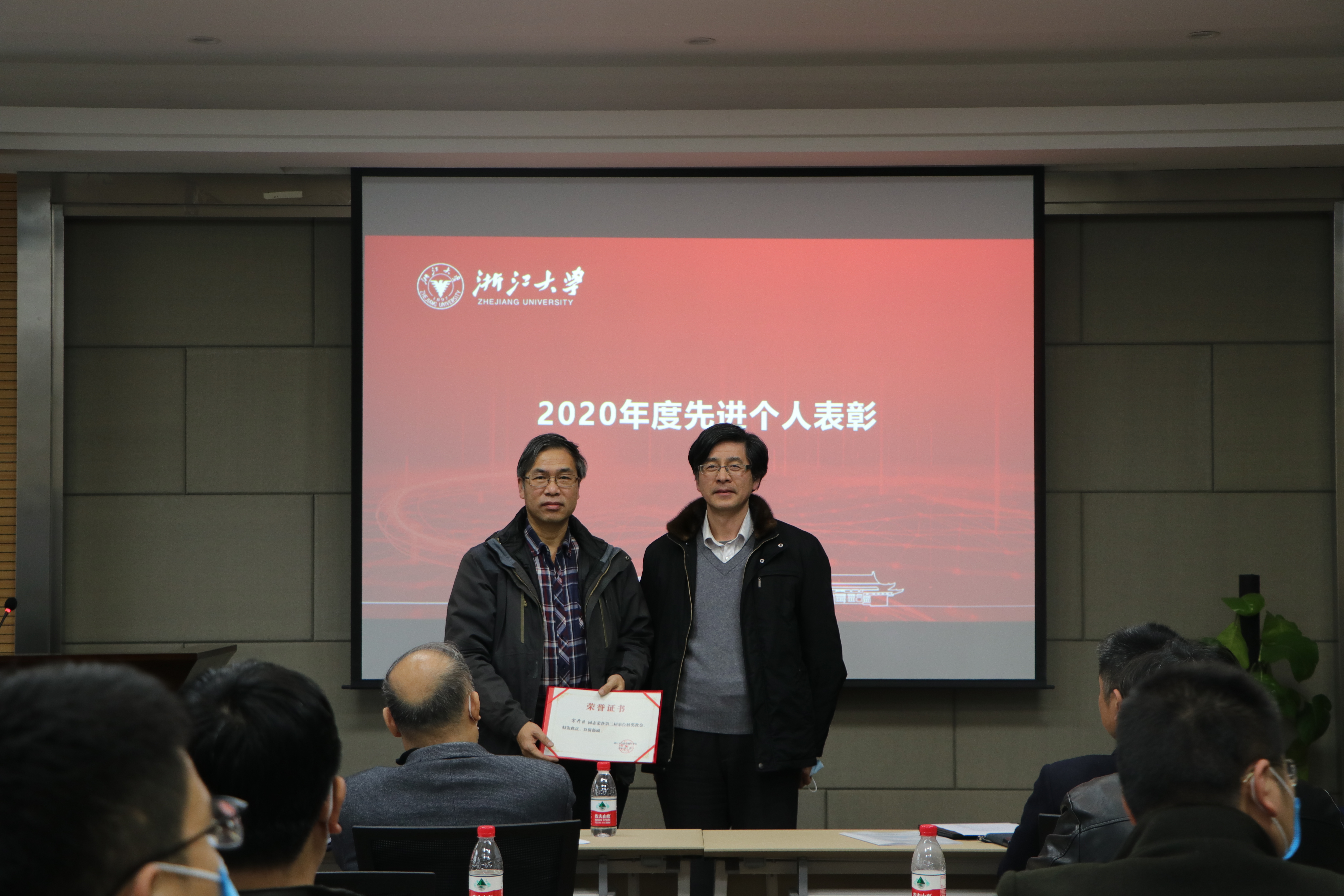 会议的第二阶段由学院党委书记毕建权主持。在表彰环节,毕建权宣读2020年度校院各类先进个人的表彰名单,朱位秋奖教金管理与评审委员代表黄志龙、学院常务副院长陈伟球分别为朱位秋奖教金获得者和院级先进个人代表颁发了荣誉证书。