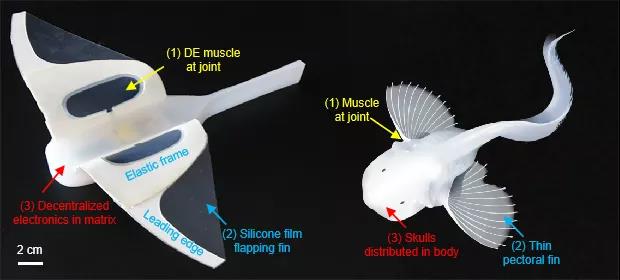 2019年12月,仿生软体机器鱼首次成功在马里亚纳海沟坐底,机器鱼随深海着陆器下潜到约10900米的海底后,在2500毫安时单节锂电池的驱动下,按照预定指令拍动翅膀,扑翼运动长达45分钟,成功实现了电驱动软体机器鱼的深海驱动。