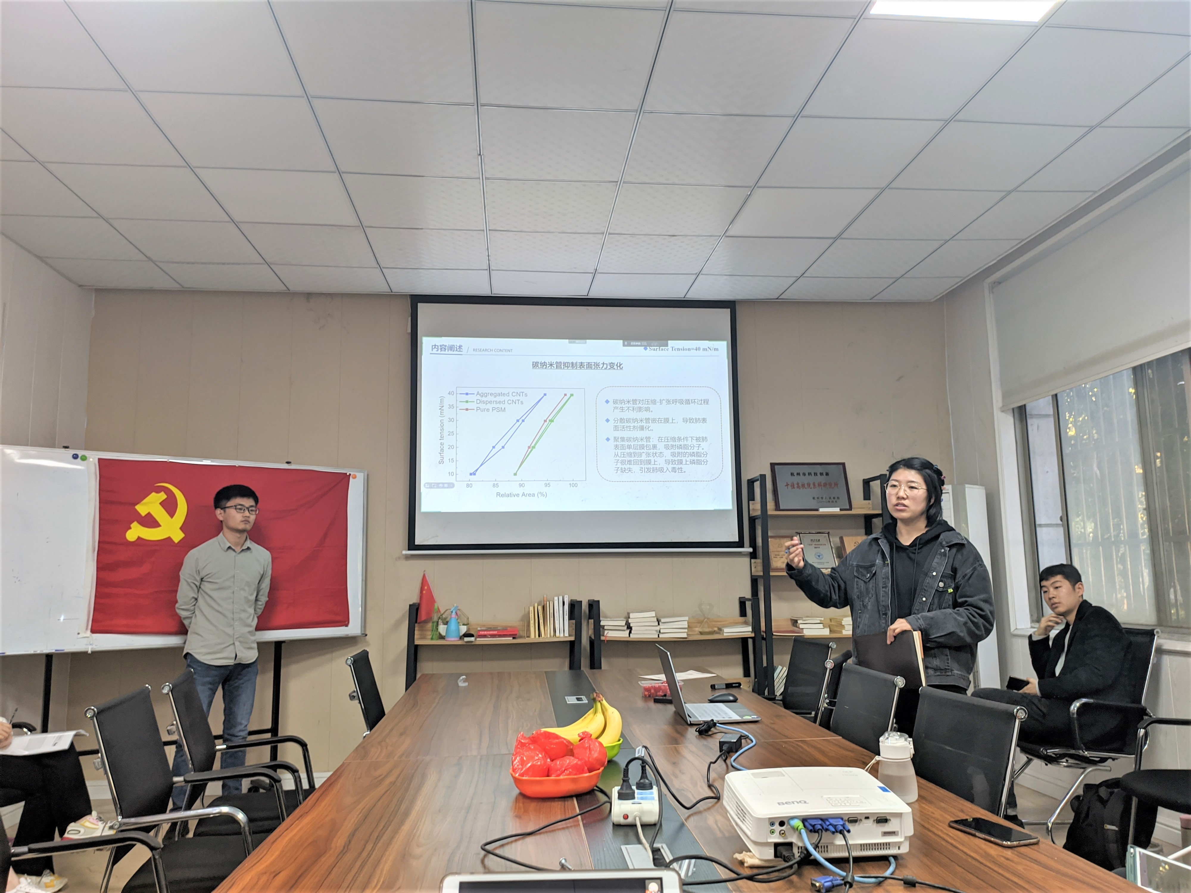 骆珍同学作题为《生物膜中纳米颗粒输运及其生物效应研究》的报告,该工作采用分子动力学模拟方法,研究吸入性单壁纳米管与肺表面活性剂之间的相互作用,分别讨论碳纳米管的尺寸以及聚集形态对两者相互作用的调控作用,以期从分子层面上解释碳纳米管对肺表面活性剂结构、性质及功能的影响。