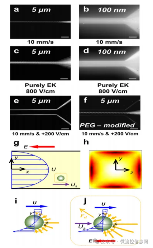 实验参数优化与纳米颗粒操控:通过系统实验,研究团队优化了电场强度、流速和聚乙二醇(PEO)溶液浓度等关键参数。实验结果表明,适当调整这些参数可以显著改善纳米颗粒的聚焦效果。在优化条件下,验证了该方法对不同尺寸纳米颗粒的高效操控能力。
