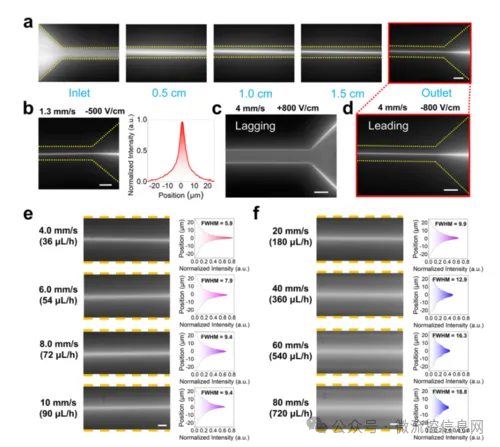 图2呈现了在优化条件下,100 nm 纳米颗粒在大尺寸微通道中的高通量聚焦过程及效果。通过荧光成像技术记录了纳米颗粒从均匀分布到逐步向通道中心聚焦的动态过程,展示了不同位置的荧光图像,以及在不同流速和电场强度下聚焦效果的量化分析。结果表明,适当调整电场方向和强度可有效驱动纳米颗粒迁移并实现聚焦,且聚焦效果随电场强度增加而显著提升,为纳米颗粒的高效操控提供了实验依据。